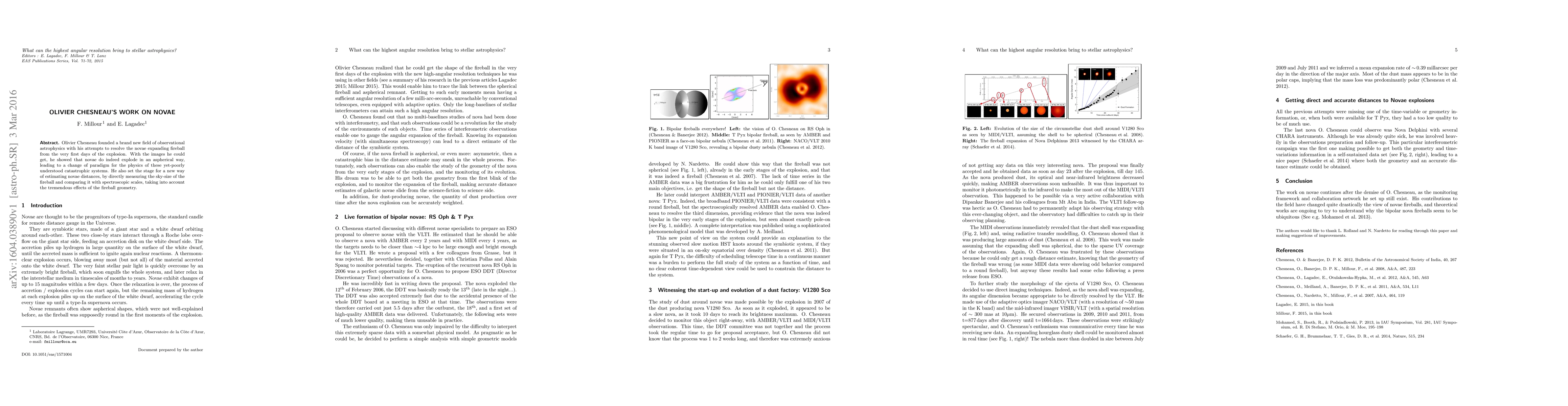 Olivier Chesneau founded a brand new field of observational astrophysics with his attempts to resolve the novae expanding fireball from the very first days of the explosion. With the images he could get, he showed that novae do indeed explode in an aspherical way, leading to a change of paradigm for the physics of these yet-poorly understood catastrophic systems. He also set the stage for a new way of estimating novae distances, by directly measuring the sky-size of the fireball and comparing it with spectroscopic scales, taking into account the tremendous effects of the fireball geometry.