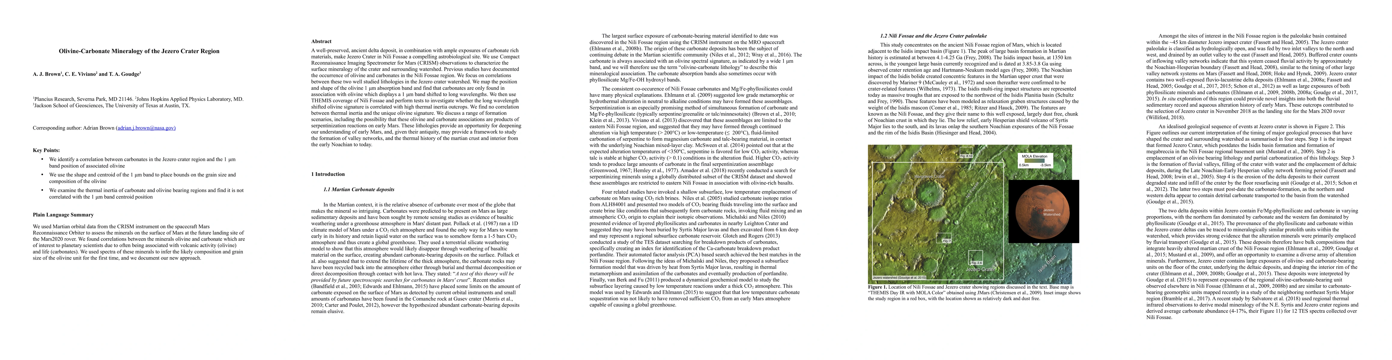 A well-preserved, ancient delta deposit, in combination with ample exposures of carbonate rich materials, make Jezero Crater in Nili Fossae a compelling astrobiological site. We use Compact Reconnaissance Imaging Spectrometer for Mars (CRISM) observations to characterize the surface mineralogy of the crater and surrounding watershed. Previous studies have documented the occurrence of olivine and carbonates in the Nili Fossae region. We focus on correlations between these two well studied lithologies in the Jezero crater watershed. We map the position and shape of the olivine 1 {\mu}m absorption band and find that carbonates are only found in association with olivine which displays a 1 {\mu}m band shifted to long wavelengths. We then use THEMIS coverage of Nili Fossae and perform tests to investigate whether the long wavelength shifted olivine signature is correlated with high thermal inertia outcrops. We find no correlation between thermal inertia and the unique olivine signature. We discuss a range of formation scenarios, including the possibility that these olivine and carbonate associations are products of serpentinization reactions on early Mars. These lithologies provide an opportunity for deepening our understanding of early Mars, and, given their antiquity, may provide a framework to study the formation of valley networks, and the thermal history of the martian crust and interior from the early Noachian to today.