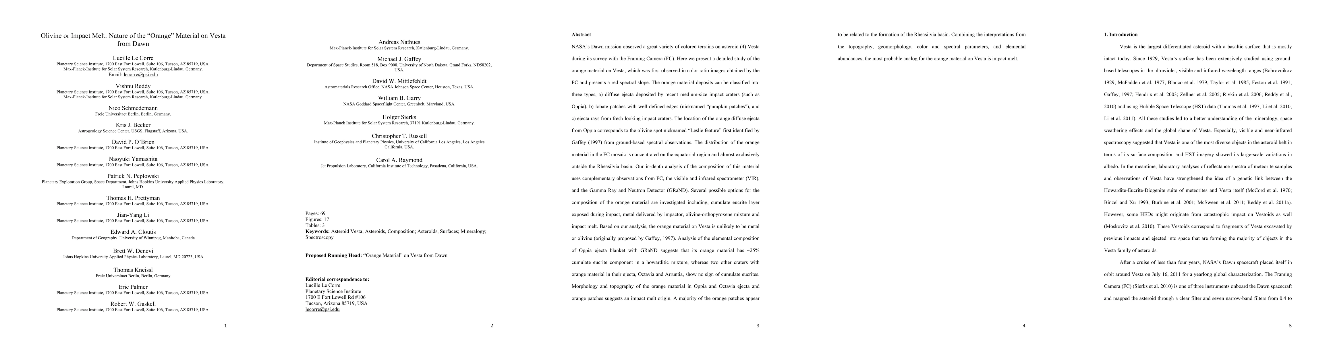 The Dawn mission identified an orange material on Vesta, classified into three types, with its composition analyzed through various instruments. The most likely origin of this material is impact melt rather than olivine, based on compositional and spectral analyses.