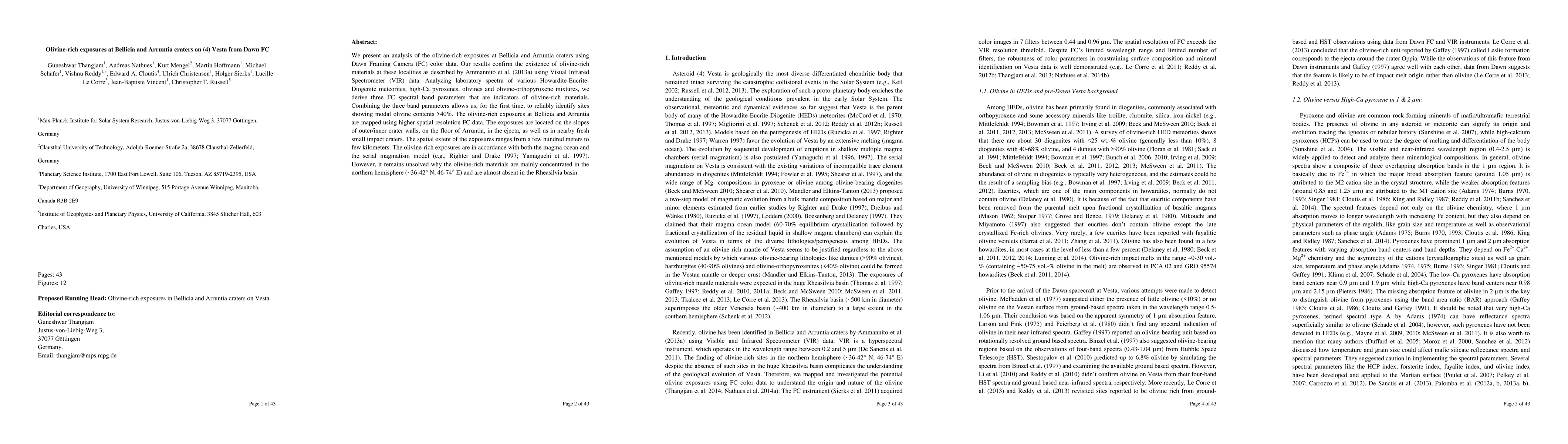 This paper analyzes olivine-rich exposures at Bellicia and Arruntia craters on Vesta using Dawn FC color data, confirming their presence and mapping their distribution. The study identifies three spectral band parameters indicating high olivine content, revealing exposures ranging from hundreds of meters to kilometers in size.