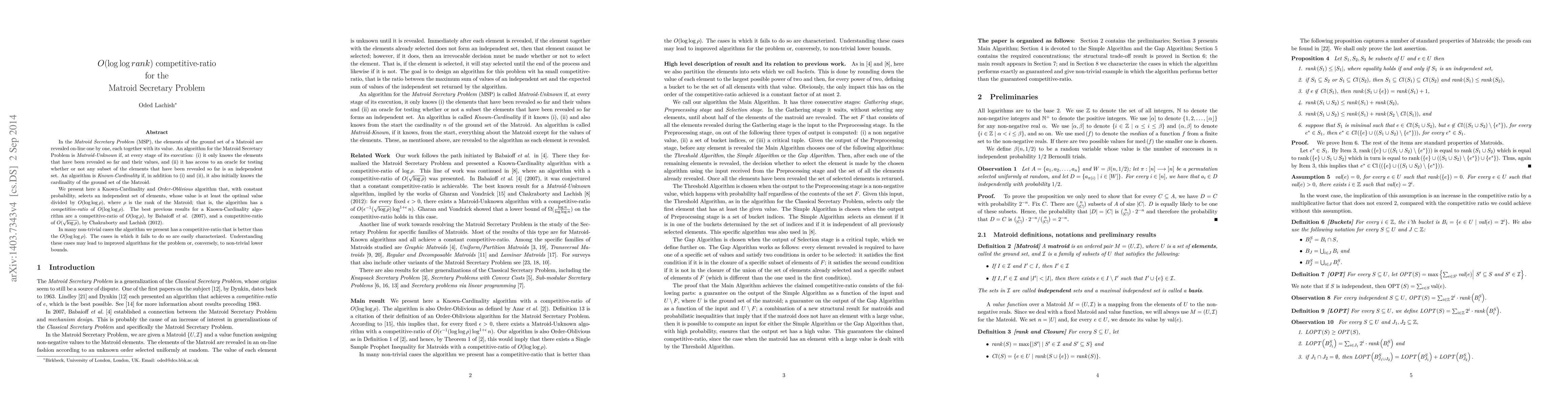 This paper introduces a Known-Cardinality and Order-Oblivious algorithm for the Matroid Secretary Problem with a competitive-ratio of $O(\log{\log{\rho}})$, where $\rho$ is the rank of the Matroid. This improves upon previous best results of $O(\log{\rho})$ and $O(\sqrt{\log{\rho}})$.