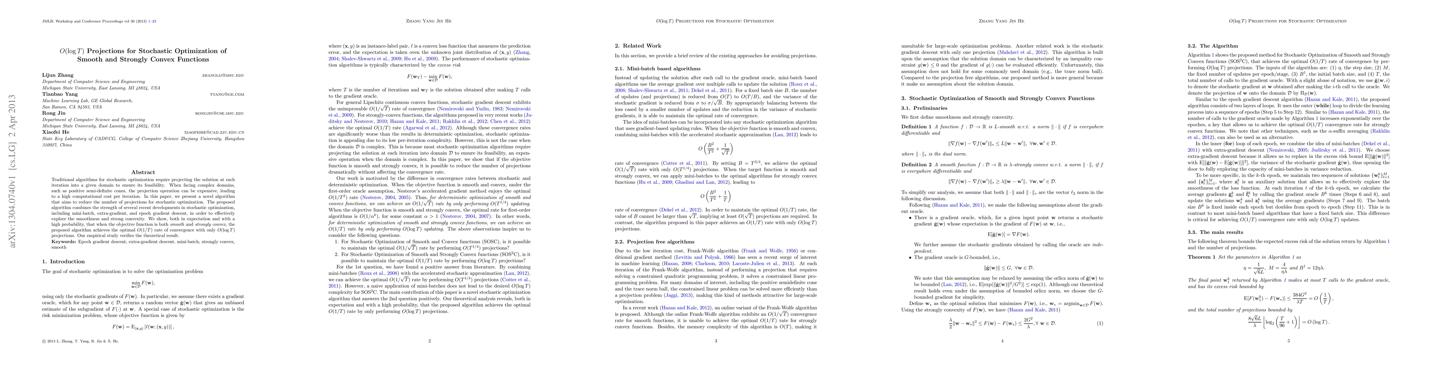 A new algorithm reduces computational cost by limiting projections to O(logT) in stochastic optimization of smooth and strongly convex functions, achieving optimal O(1/T) convergence rate.