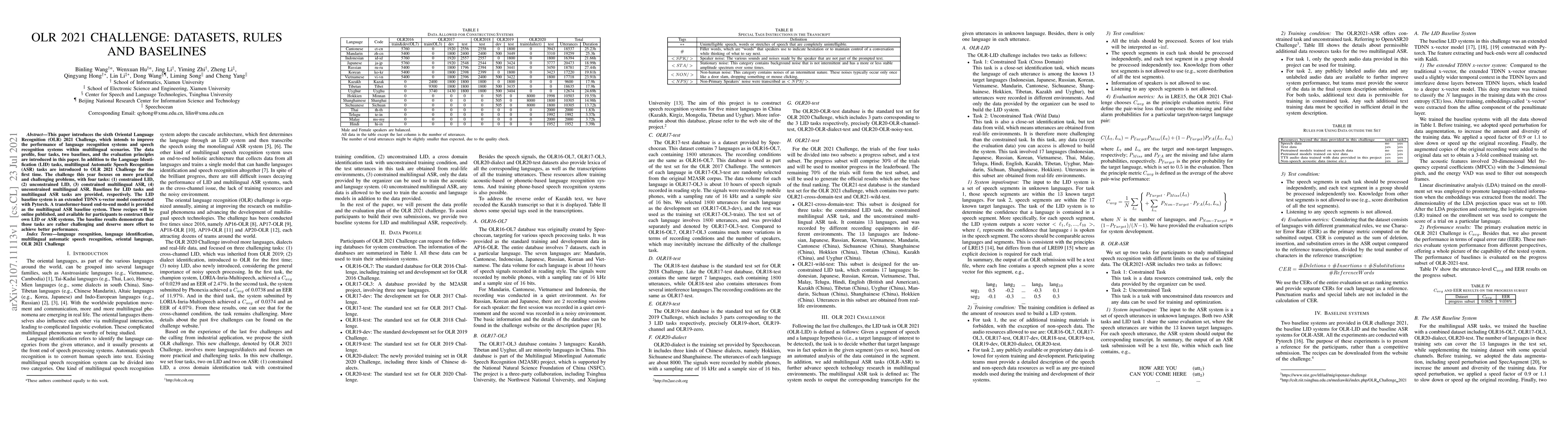 The OLR 2021 Challenge introduces four multilingual tasks to improve language recognition systems and speech recognition systems, with baseline models available for participants to test their own systems.
