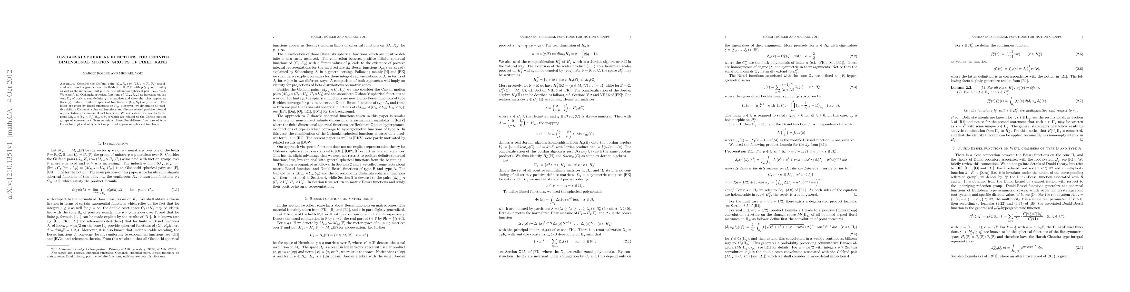Consider the Gelfand pairs $(G_p,K_p):=(M_{p,q} \rtimes U_p,U_p)$ associated with motion groups over the fields $\mathbb F=\mathbb R,\mathbb C,\mathbb H$ with $p\geq q$ and fixed $q$ as well as the inductive limit $p\to\infty$,the Olshanski spherical pair $(G_\infty,K_\infty)$. We classify all Olshanski spherical functions of $(G_\infty,K_\infty)$ as functions on the cone $\Pi_q$ of positive semidefinite $q\times q$-matrices and show that they appear as (locally) uniform limits of spherical functions of $(G_p,K_p)$ as $p\to\infty$. The latter are given by Bessel functions on $\Pi_q$. Moreover, we determine all positive definite Olshanski spherical functions and discuss related positive integral representations for matrix Bessel functions. We also extend the results to the pairs $(M_{p,q} \rtimes (U_p\times U_q),(U_p\times U_q))$ which are related to the Cartan motion groups of non-compact Grassmannians. Here Dunkl-Bessel functions of type B (for finite $p$) and of type A (for $p\to\infty$) appear as spherical functions.
