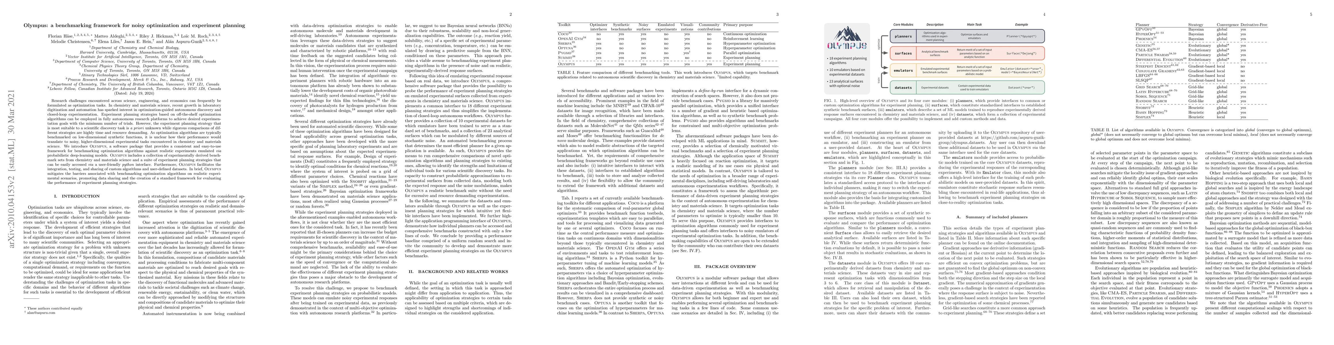 Olympus is a benchmarking framework for evaluating optimization algorithms in noisy, high-dimensional experimental tasks, particularly in chemistry and materials science. It provides a user-friendly interface for testing various experiment planning strategies against realistic experimental datasets, facilitating data sharing and algorithm integration.