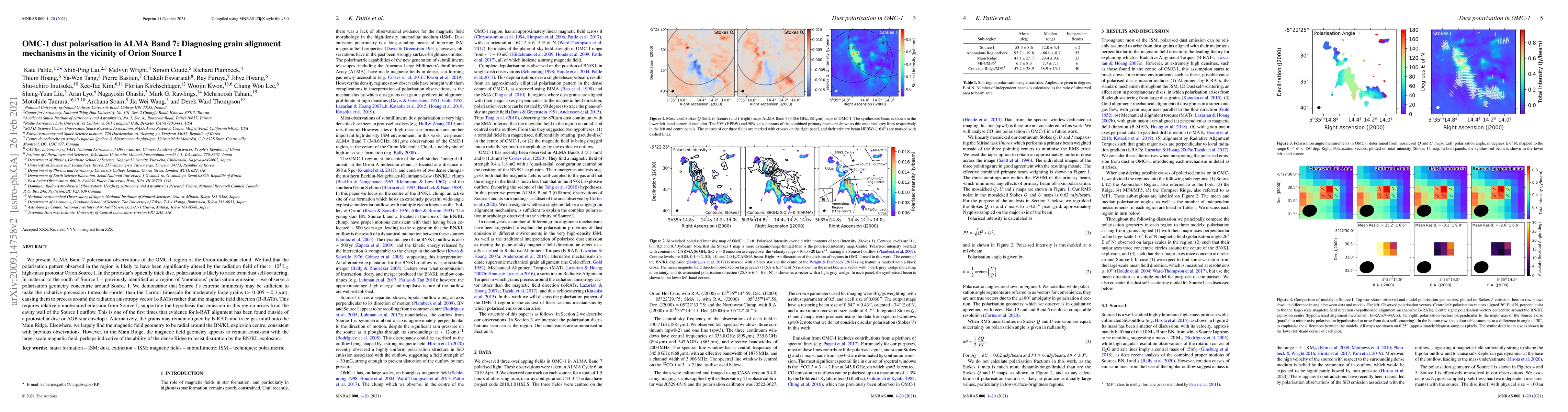 This paper uses ALMA Band 7 polarisation observations to study dust grain alignment mechanisms in the OMC-1 region near Orion Source I. The findings suggest that the high-mass protostar's intense radiation field causes dust grains to align via radiative precession, rather than magnetic fields, in the protostar's disc and south region.