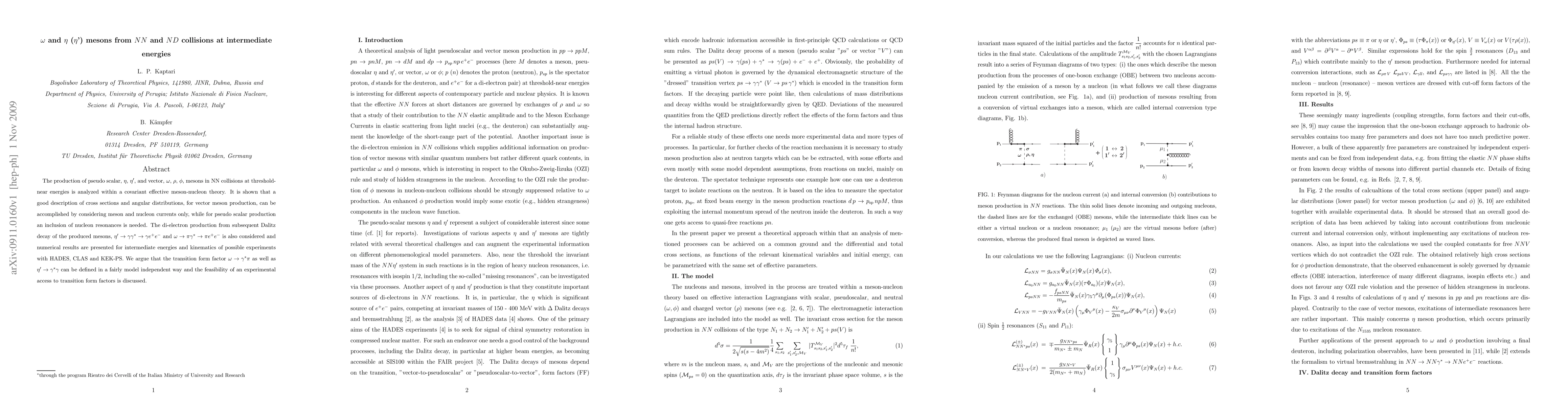 The production of pseudo scalar, Eeta, Eta-prime, and vector, Omega, Rho, Phi, mesons in NN collisions at threshold-near energies is analyzed within a covariant effective meson-nucleon theory. It is shown that a good description of cross sections and angular distributions, for vector meson production, can be accomplished by considering meson and nucleon currents only, while for pseudo scalar production an inclusion of nucleon resonances is needed. The di-electron production from subsequent Dalitz decay of the produced mesons, $\eta'\to \gamma \gamma^* \to\gamma e^+e^-$ and $\omega\to \pi\gamma^*\to \pi e^+e^-$ is also considered and numerical results are presented for intermediate energies and kinematics of possible experiments with HADES, CLAS and KEK-PS. We argue that the transition form factor $\omega\to \gamma^*\pi$ as well as $\eta'\to \gamma^*\gamma$ can be defined in a fairly model independent way and the feasibility of an experimental access to transition form factors is discussed.