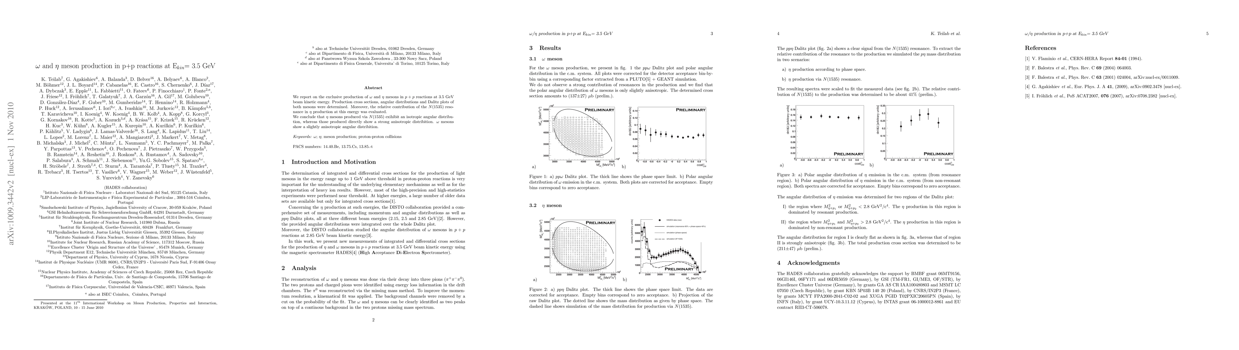 We report on the exclusive production of omega and eta mesons in p+p reactions at 3.5 GeV beam kinetic energy. Production cross sections, angular distributions and Dalitz plots of both mesons were determined. Moreover, the relative contribution of the N(1535) resonance in eta production at this energy was evaluated. We conclude that eta mesons produced via N(1535) exihibit an isotropic angular distribution, whereas those produced directly show a strong anisotropic distribition. omega mesons show a slightly anisotropic angular distribition.