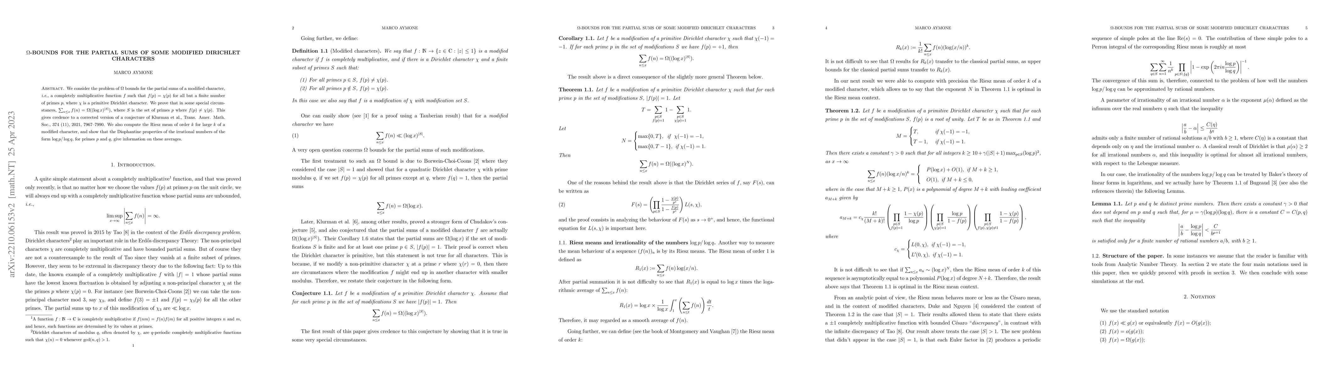 We consider the problem of $\Omega$ bounds for the partial sums of a modified character, \textit{i.e.}, a completely multiplicative function $f$ such that $f(p)=\chi(p)$ for all but a finite number of primes $p$, where $\chi$ is a primitive Dirichlet character. We prove that in some special circumstances, $\sum_{n\leq x}f(n)=\Omega((\log x)^{|S|})$, where $S$ is the set of primes $p$ where $f(p)\neq \chi(p)$. This gives credence to a corrected version of a conjecture of Klurman et al., Trans. Amer. Math. Soc., 374 (11), 2021, 7967-7990. We also compute the Riesz mean of order $k$ for large $k$ of a modified character, and show that the Diophantine properties of the irrational numbers of the form $\log p / \log q$, for primes $p$ and $q$, give information on these averages.