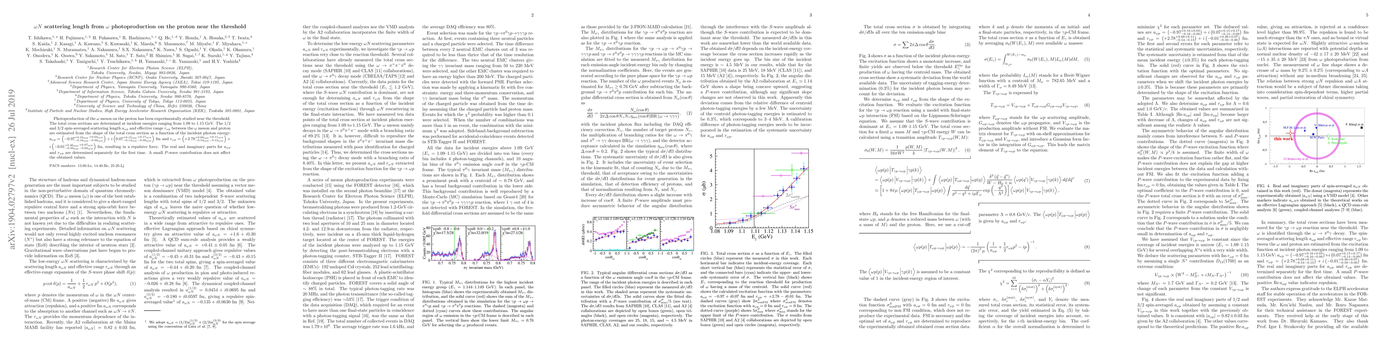 Photoproduction of the $\omega$ meson on the proton has been experimentally studied near the threshold. The total cross sections are determined at incident energies ranging from 1.09 to 1.15 GeV. The 1/2 and 3/2 spin-averaged scattering length $a_{\omega p}$ and effective range $r_{\omega p}$ between the $\omega$ meson and proton are estimated from the shape of the total cross section as a function of the incident photon energy: $a_{\omega p} = \left(-0.97^{+0.16_{\rm stat}}_{-0.16_{\rm stat}}{}^{+0.03_{\rm syst}}_{-0.00_{\rm syst}}\right)+i \left(0.07^{+0.15_{\rm stat}}_{-0.14_{\rm stat}}{}^{+0.17_{\rm syst}}_{-0.09_{\rm syst}}\right)$ fm and $r_{\omega p}=\left(+2.78^{+0.68_{\rm stat}}_{-0.54_{\rm stat}}{}^{+0.11_{\rm syst}}_{-0.13_{\rm syst}}\right)+i\left(-0.01^{+0.46_{\rm stat}}_{-0.50_{\rm stat}}{}^{+0.07_{\rm syst}}_{-0.00_{\rm syst}}\right)$ fm, resulting in a repulsive force. The real and imaginary parts for $a_{\omega p}$ and $r_{\omega p}$ are determined separately for the first time. A small $P$-wave contribution does not affect the obtained values.
