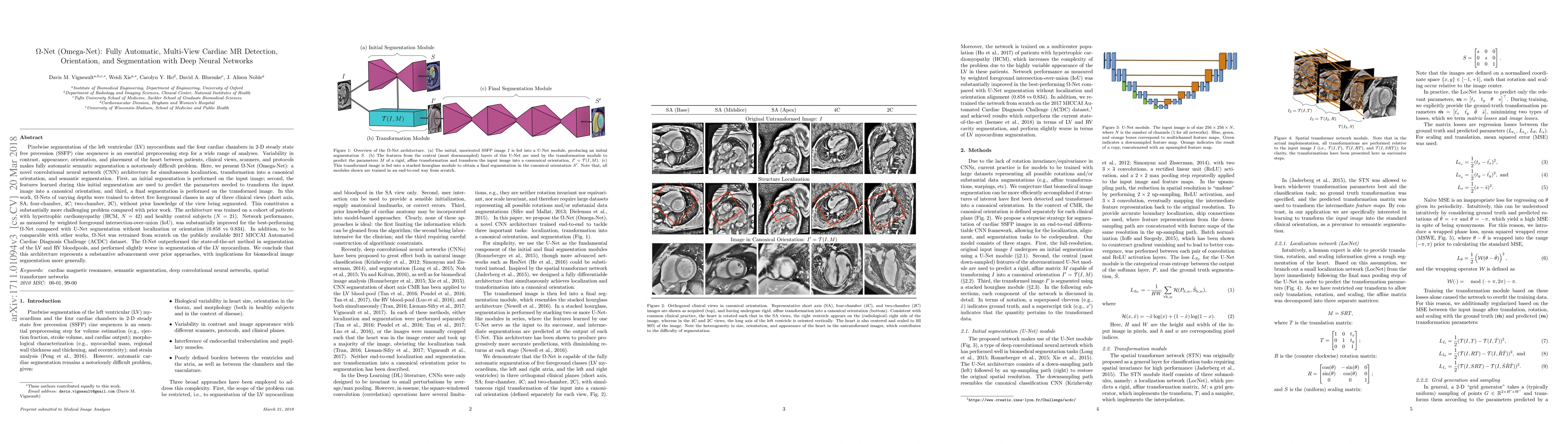 Pixelwise segmentation of the left ventricular (LV) myocardium and the four cardiac chambers in 2-D steady state free precession (SSFP) cine sequences is an essential preprocessing step for a wide range of analyses. Variability in contrast, appearance, orientation, and placement of the heart between patients, clinical views, scanners, and protocols makes fully automatic semantic segmentation a notoriously difficult problem. Here, we present ${\Omega}$-Net (Omega-Net): a novel convolutional neural network (CNN) architecture for simultaneous localization, transformation into a canonical orientation, and semantic segmentation. First, an initial segmentation is performed on the input image, second, the features learned during this initial segmentation are used to predict the parameters needed to transform the input image into a canonical orientation, and third, a final segmentation is performed on the transformed image. In this work, ${\Omega}$-Nets of varying depths were trained to detect five foreground classes in any of three clinical views (short axis, SA, four-chamber, 4C, two-chamber, 2C), without prior knowledge of the view being segmented. The architecture was trained on a cohort of patients with hypertrophic cardiomyopathy and healthy control subjects. Network performance as measured by weighted foreground intersection-over-union (IoU) was substantially improved in the best-performing ${\Omega}$- Net compared with U-Net segmentation without localization or orientation. In addition, {\Omega}-Net was retrained from scratch on the 2017 MICCAI ACDC dataset, and achieves state-of-the-art results on the LV and RV bloodpools, and performed slightly worse in segmentation of the LV myocardium. We conclude this architecture represents a substantive advancement over prior approaches, with implications for biomedical image segmentation more generally.