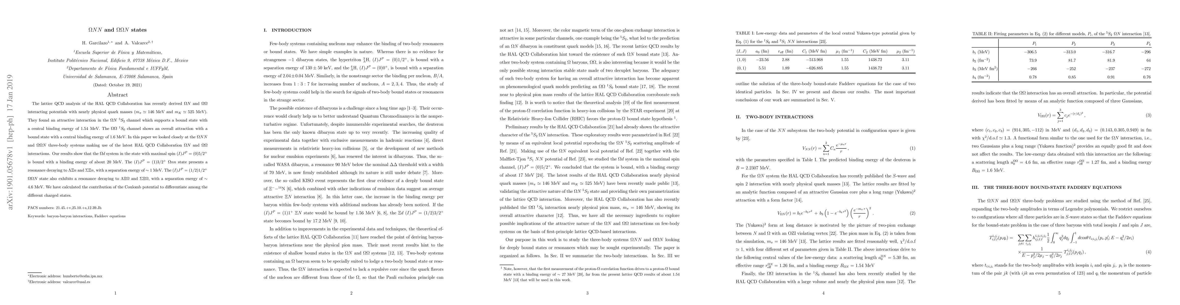 The lattice QCD analysis of the HAL QCD Collaboration has recently derived $\Omega N$ and $\Omega\Omega$ interacting potentials with nearly physical quark masses ($m_\pi \simeq $ 146 MeV and $m_K \simeq $ 525 MeV). They found an attractive interaction in the $\Omega N$ $^5S_2$ channel which supports a bound state with a central binding energy of 1.54 MeV. The $\Omega \Omega$ $^1S_0$ channel shows an overall attraction with a bound state with a central binding energy of 1.6 MeV. In this paper we looked closely at the $\Omega NN$ and $\Omega\Omega N$ three-body systems making use of the latest HAL QCD Collaboration $\Omega N$ and $\Omega\Omega$ interactions. Our results show that the $\Omega d$ system in the state with maximal spin $(I)J^P=(0)5/2^+$ is bound with a binding energy of about 20 MeV. The $(I)J^P=(1)3/2^+$ $\Omega nn$ state presents a resonance decaying to $\Lambda \Xi n$ and $\Sigma \Xi n$, with a separation energy of $\sim$ 1 MeV. The $(I)J^P=(1/2)1/2^+$ $\Omega \Omega N$ state also exhibits a resonance decaying to $\Lambda \Xi \Omega$ and $\Sigma \Xi \Omega$, with a separation energy of $\sim$ 4.6 MeV. We have calculated the contribution of the Coulomb potential to differentiate among the different charged states.