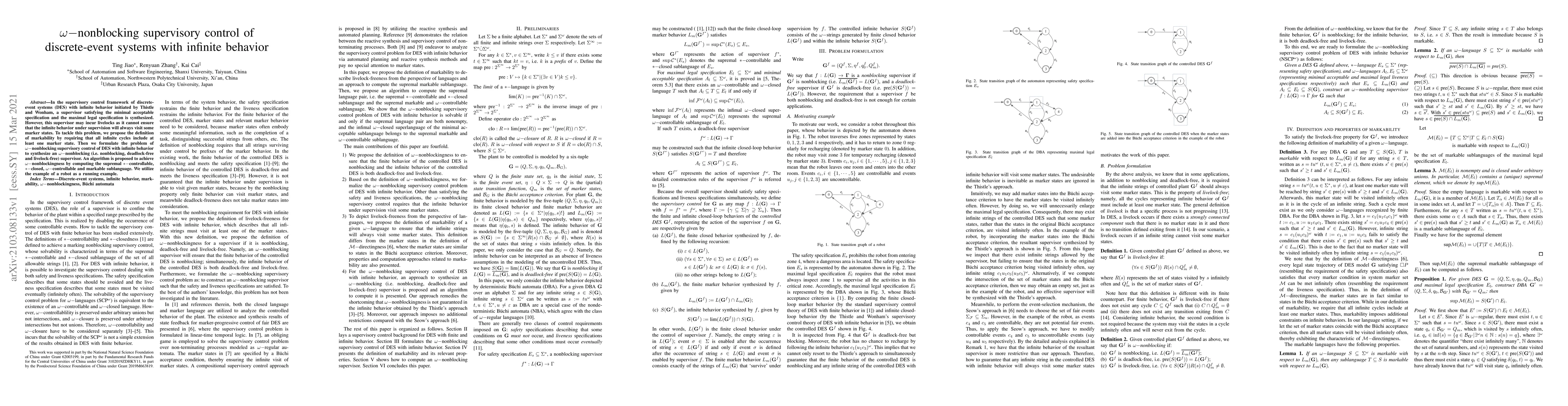In the supervisory control framework of discrete-event systems (DES) with infinite behavior initiated by Thistle and Wonham, a supervisor satisfying the minimal acceptable specification and the maximal legal specification is synthesized. However, this supervisor may incur livelocks as it cannot ensure that the infinite behavior under supervision will always visit some marker states. To tackle this problem, we propose the definition of markability by requiring that all infinite cycles include at least one marker state. Then we formulate the problem of $\omega-$nonblocking supervisory control of DES with infinite behavior to synthesize an $\omega-$nonblocking (i.e. nonblocking, deadlock-free and livelock-free) supervisor. An algorithm is proposed to achieve $\omega-$nonblockingness by computing the supremal $*-$controllable, $*-$closed, $\omega-$controllable and markable sublanguage. We utilize the example of a robot as a running example.