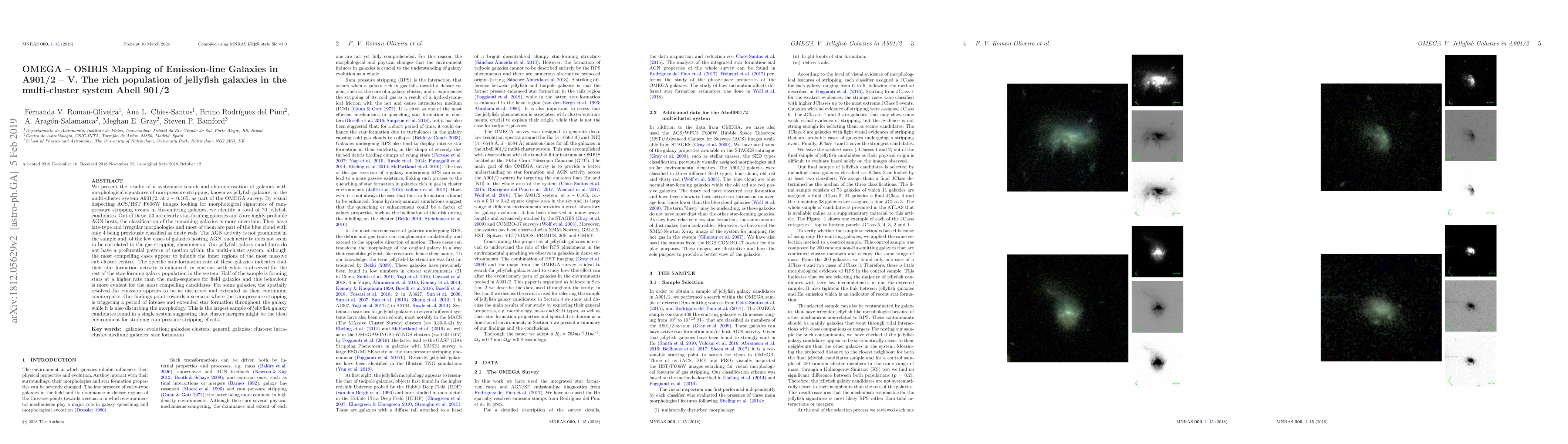 The OMEGA survey identifies 70 jellyfish galaxy candidates in the A901/2 multi-cluster system, revealing that ram-pressure stripping triggers enhanced star formation, with half the sample forming stars at a higher rate than typical field galaxies. The findings suggest cluster mergers are ideal environments for studying these stripping effects.