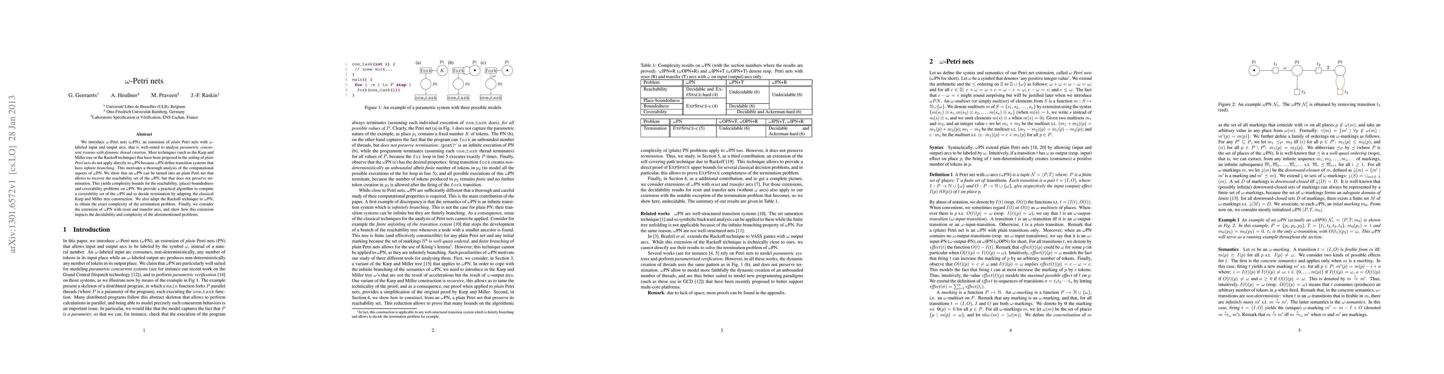 {\omega}-Petri nets extend traditional Petri nets with {\omega}-labeled arcs to analyze parametric concurrent systems with dynamic thread creation. The paper provides complexity bounds for reachability, boundedness, and coverability problems, and introduces adapted algorithms for termination analysis and coverability set computation.