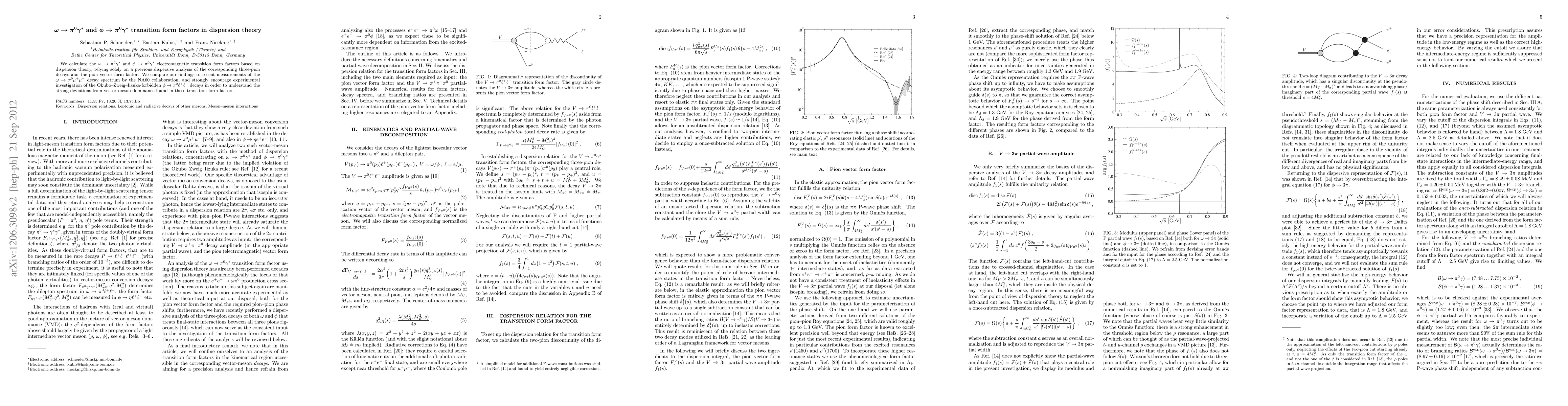 This paper calculates the electromagnetic transition form factors for omega and phi mesons decaying into a pion and a photon using dispersion theory, relying on previous analyses of three-pion decays and pion vector form factors. It compares results to NA60 measurements and advocates for further experimental studies of phi meson decays to better understand deviations from vector-meson dominance.