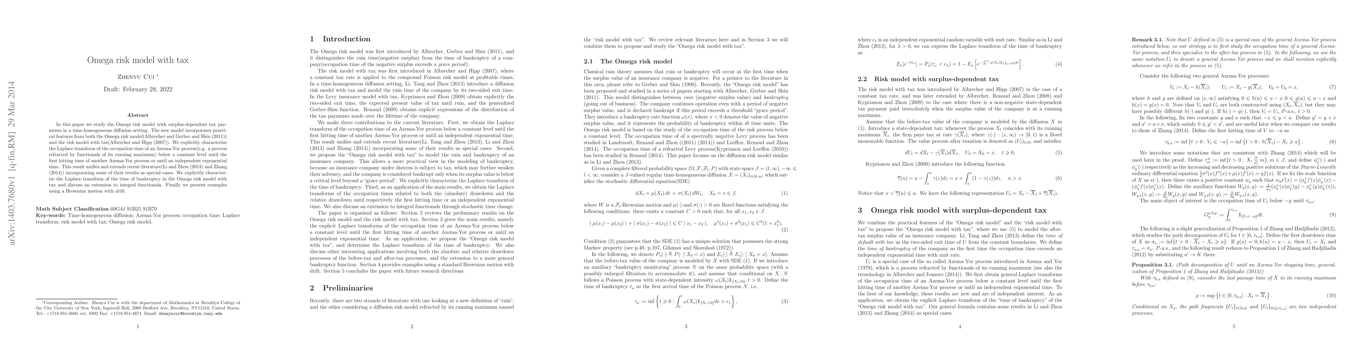 In this paper we study the Omega risk model with surplus-dependent tax payments in a time-homogeneous diffusion setting. The new model incorporates practical features from both the Omega risk model(Albrecher and Gerber and Shiu (2011)) and the risk model with tax(Albrecher and Hipp (2007)). We explicitly characterize the Laplace transform of the occupation time of an Azema-Yor process(e.g. a process refracted by functionals of its running maximum) below a constant level until the first hitting time of another Azema-Yor process or until an independent exponential time. This result unifies and extends recent literature(Li and Zhou (2013) and Zhang (2014)) incorporating some of their results as special cases. We explicitly characterize the Laplace transform of the time of bankruptcy in the Omega risk model with tax and discuss an extension to integral functionals. Finally we present examples using a Brownian motion with drift.