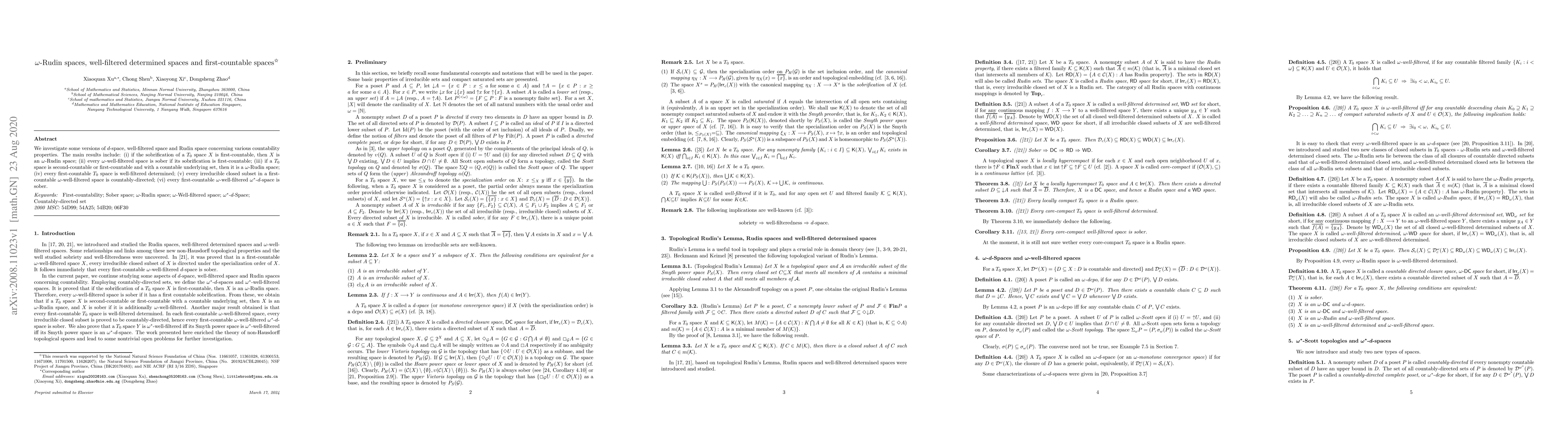This paper explores various topological properties related to $d$-spaces, well-filtered spaces, and Rudin spaces, focusing on countability aspects. Key findings include that first-countability in the sobrification of a $T_0$ space implies it is an $\omega$-Rudin space, and every first-countable $T_0$ space is well-filtered determined.