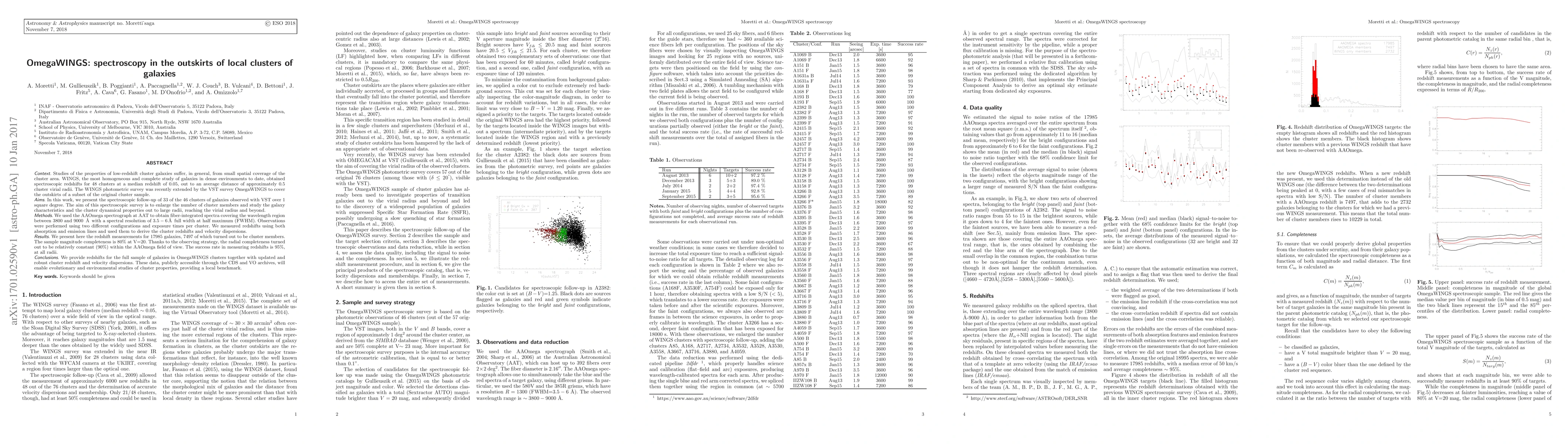 This paper presents a spectroscopic survey of 33 clusters from the OmegaWINGS project, extending the WINGS survey to cover the outskirts of local clusters. The study aims to enhance the understanding of galaxy characteristics and cluster dynamics at large radii, utilizing the AAOmega spectrograph to obtain redshift measurements for 17,985 galaxies, with 95% success rate and 90% radial completeness.