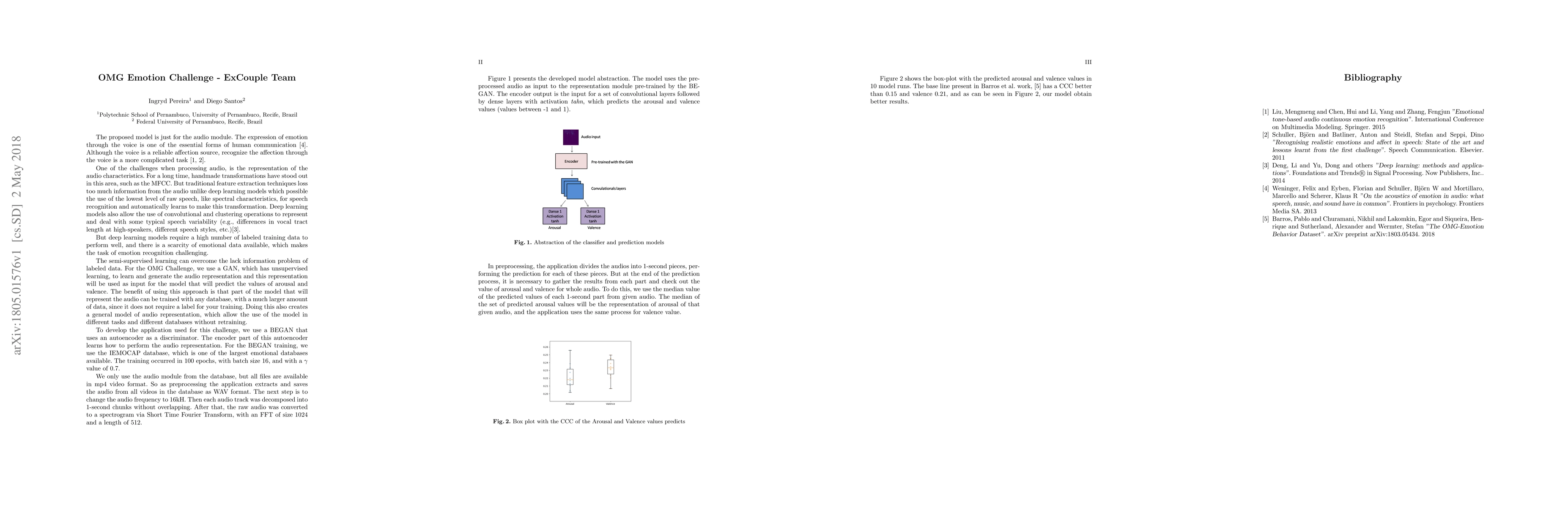 The proposed model is only for the audio module. All videos in the OMG Emotion Dataset are converted to WAV files. The proposed model makes use of semi-supervised learning for the emotion recognition. A GAN is trained with unsupervised learning, with another database (IEMOCAP), and part of the GAN structure (part of the autoencoder) will be used for the audio representation. The audio spectrogram will be extracted in 1-second windows of 16khz frequency, and this will serve as input to the model of audio representation trained with another database in an unsupervised way. This audio representation will serve as input to a convolutional network and a Dense layer with 'tanh' activation that performs the prediction of Arousal and Valence values. For joining the 1-second pieces of audio, the median of the predicted values of a given utterance will be taken.