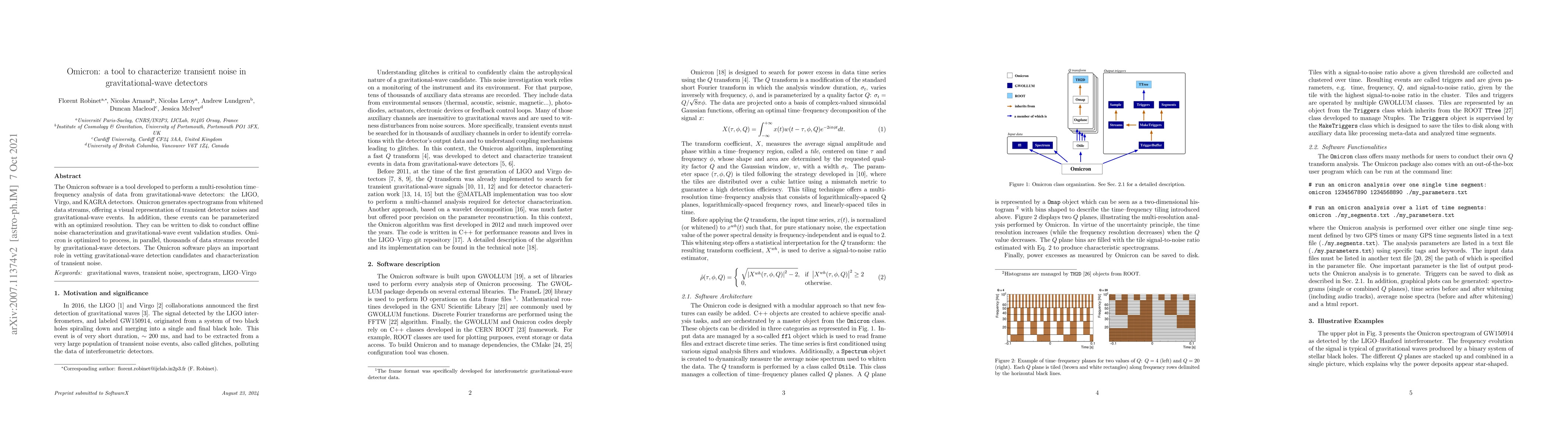The Omicron software performs multi-resolution time-frequency analysis of gravitational-wave detector data, generating spectrograms to visualize transient noise and events, and facilitating offline noise characterization and validation studies. It efficiently processes thousands of data streams in parallel, aiding in the vetting of gravitational-wave detection candidates.