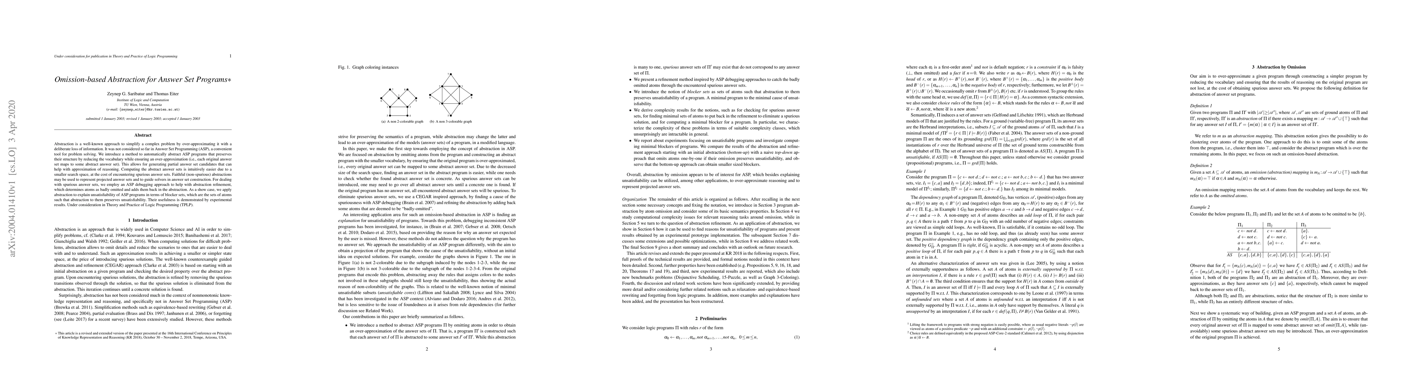 This paper introduces a method to automatically abstract Answer Set Programs (ASP) through omission-based abstraction, which simplifies ASP by reducing vocabulary while ensuring an over-approximation. It addresses spurious answer sets using an ASP debugging approach and demonstrates the method’s effectiveness in explaining unsatisfiability via blocker sets.