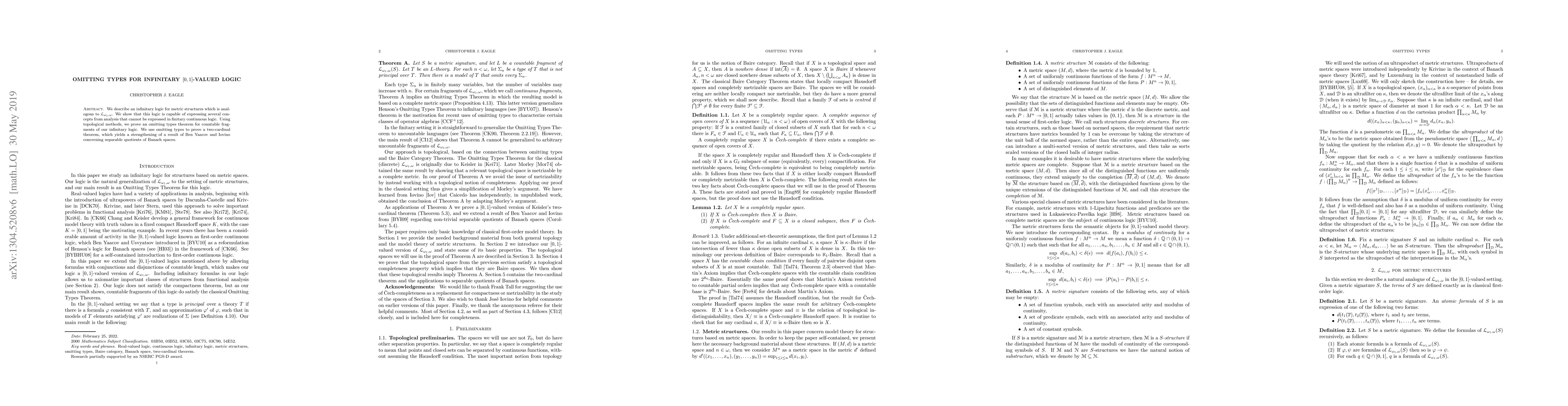 This paper introduces an infinitary logic for metric structures analogous to $L_{\omega_1, \omega}$ that can express analysis concepts beyond finitary continuous logic. It proves an omitting types theorem for countable fragments, utilizing it to strengthen a result on separable quotients of Banach spaces.