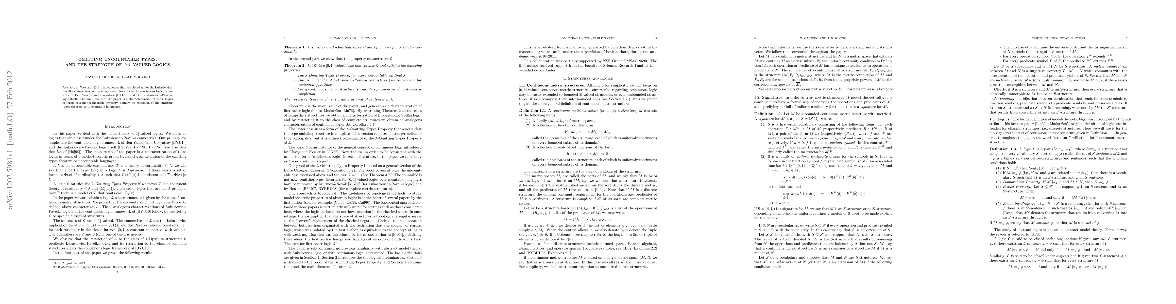 We study $[0,1]$-valued logics that are closed under the {\L}ukasiewicz-Pavelka connectives; our primary examples are the the continuous logic framework of Ben Yaacov and Usvyatsov \cite{Ben-Yaacov-Usvyatsov:2010} and the {\L}ukasziewicz-Pavelka logic itself. The main result of the paper is a characterization of these logics in terms of a model-theoretic property, namely, an extension of the omitting types theorem to uncountable languages.