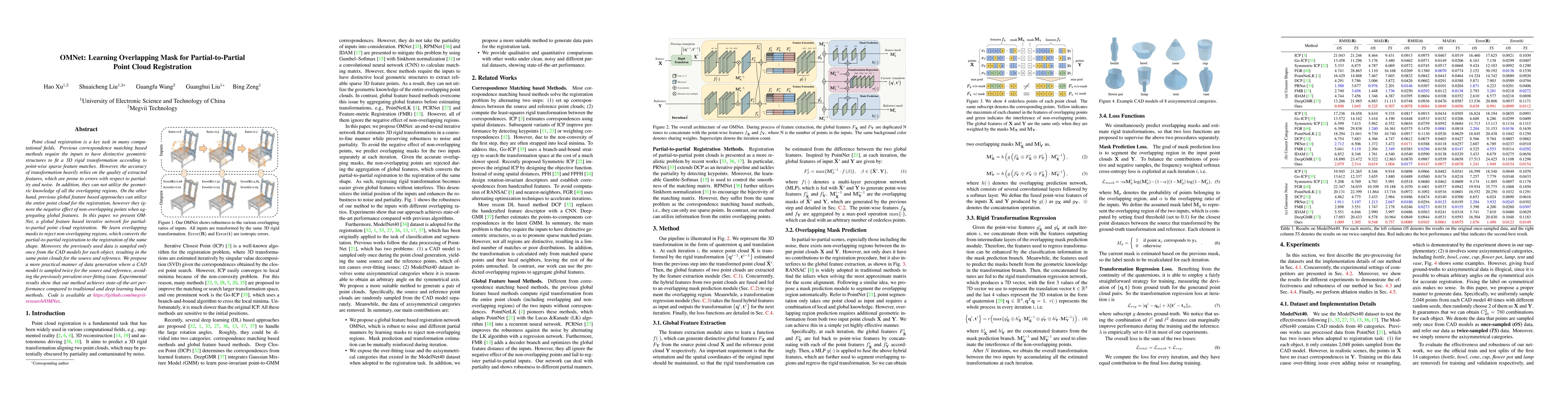 OMNet introduces an iterative network for partial-to-partial point cloud registration that learns overlapping masks to focus on overlapping regions, improving accuracy over traditional methods. It also employs a dual sampling approach to generate data, mitigating overfitting and achieving state-of-the-art performance.