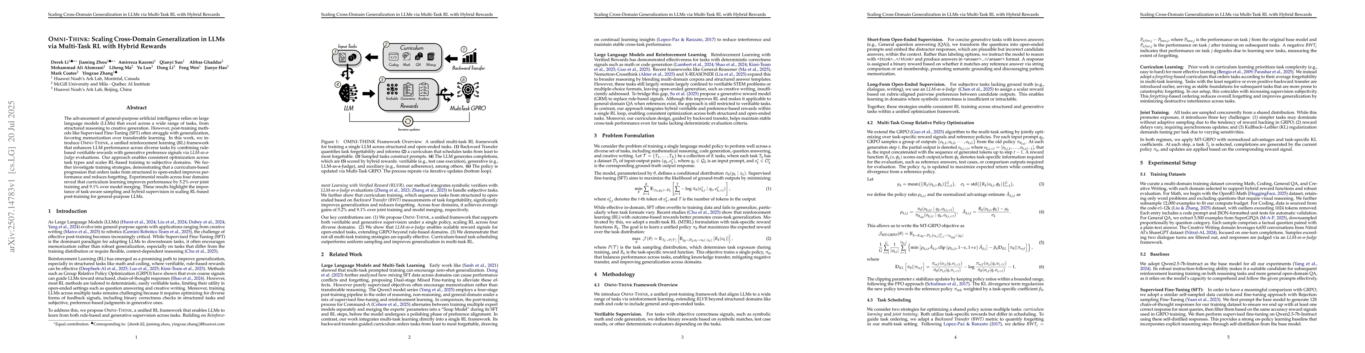 The research introduces Omni-Think, a reinforcement learning framework that improves large language models' (LLMs) performance across various tasks by merging rule-based rewards with generative preferences. This hybrid approach, combined with a curriculum-based task ordering, enhances generalization and reduces forgetting, leading to a 5.2% performance improvement over joint training and 9.1% over model merging across four domains.