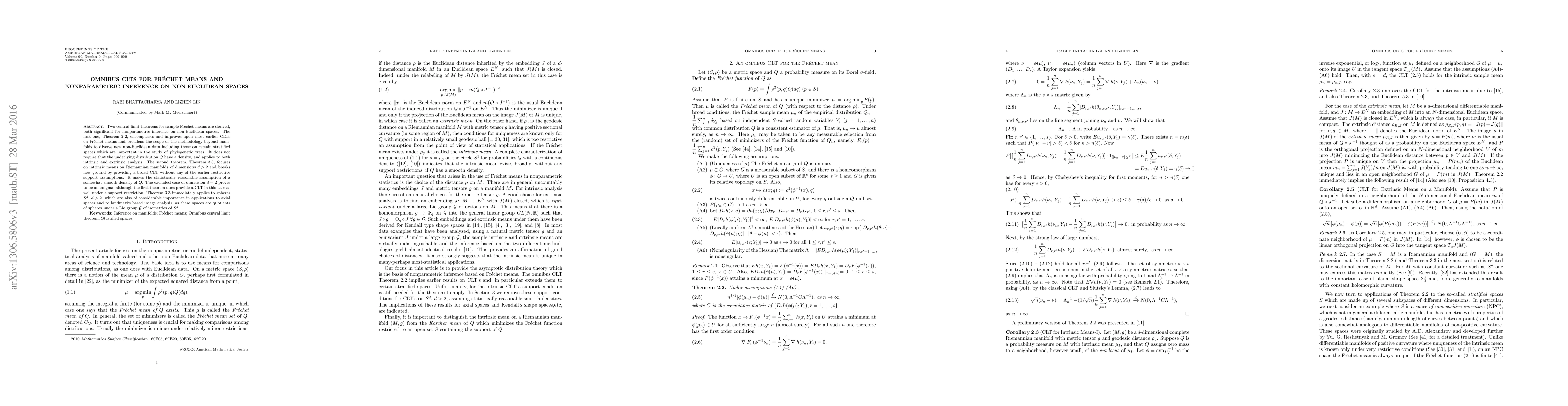 Two central limit theorems for sample Fr\'echet means are derived, both significant for nonparametric inference on non-Euclidean spaces. The first one, Theorem 2.2, encompasses and improves upon most earlier CLTs on Fr\'echet means and broadens the scope of the methodology beyond manifolds to diverse new non-Euclidean data including those on certain stratified spaces which are important in the study of phylogenetic trees. It does not require that the underlying distribution $Q$ have a density, and applies to both intrinsic and extrinsic analysis. The second theorem, Theorem 3.3, focuses on intrinsic means on Riemannian manifolds of dimensions $d>2$ and breaks new ground by providing a broad CLT without any of the earlier restrictive support assumptions. It makes the statistically reasonable assumption of a somewhat smooth density of $Q$. The excluded case of dimension $d=2$ proves to be an enigma, although the first theorem does provide a CLT in this case as well under a support restriction. Theorem 3.3 immediately applies to spheres $S^d$, $d>2$, which are also of considerable importance in applications to axial spaces and to landmarks based image analysis, as these spaces are quotients of spheres under a Lie group $\mathcal G $ of isometries of $S^d$.