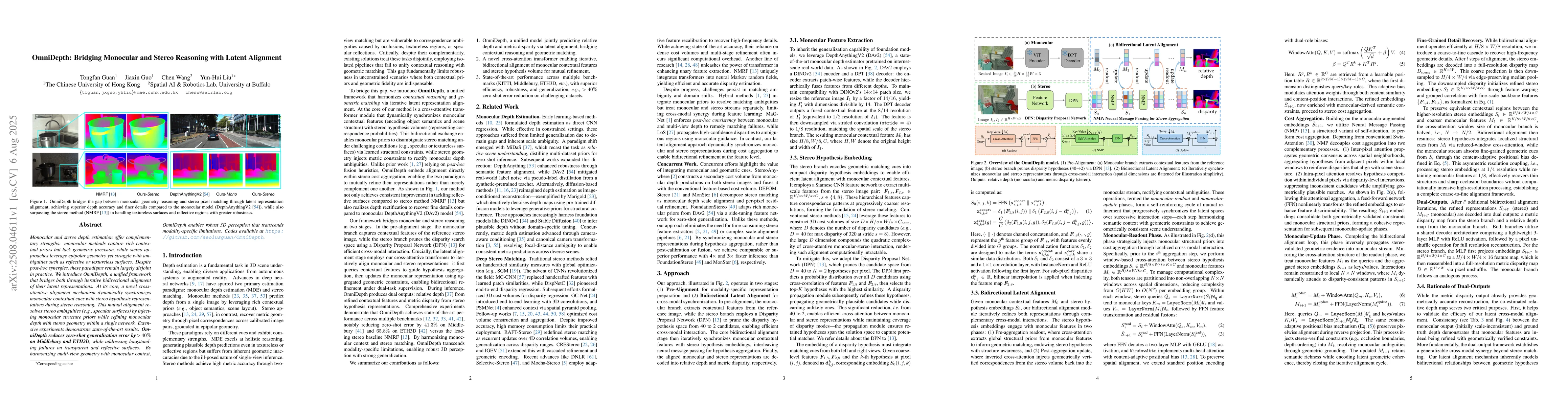 Monocular and stereo depth estimation offer complementary strengths: monocular methods capture rich contextual priors but lack geometric precision, while stereo approaches leverage epipolar geometry yet struggle with ambiguities such as reflective or textureless surfaces. Despite post-hoc synergies, these paradigms remain largely disjoint in practice. We introduce OmniDepth, a unified framework that bridges both through iterative bidirectional alignment of their latent representations. At its core, a novel cross-attentive alignment mechanism dynamically synchronizes monocular contextual cues with stereo hypothesis representations during stereo reasoning. This mutual alignment resolves stereo ambiguities (e.g., specular surfaces) by injecting monocular structure priors while refining monocular depth with stereo geometry within a single network. Extensive experiments demonstrate state-of-the-art results: \textbf{OmniDepth reduces zero-shot generalization error by $\!>\!40\%$ on Middlebury and ETH3D}, while addressing longstanding failures on transparent and reflective surfaces. By harmonizing multi-view geometry with monocular context, OmniDepth enables robust 3D perception that transcends modality-specific limitations. Codes available at https://github.com/aeolusguan/OmniDepth.