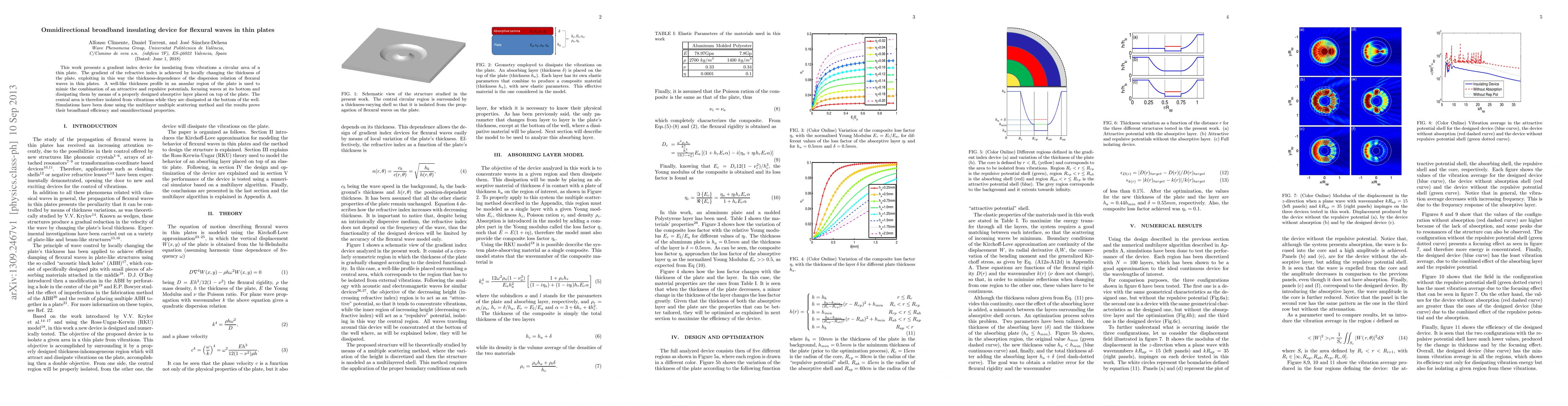 This research introduces a gradient index device that isolates a circular area in thin plates from flexural waves by altering the plate's thickness, creating a well-like profile to focus and dissipate vibrations, validated through simulations showing broadband and omnidirectional insulating efficiency.