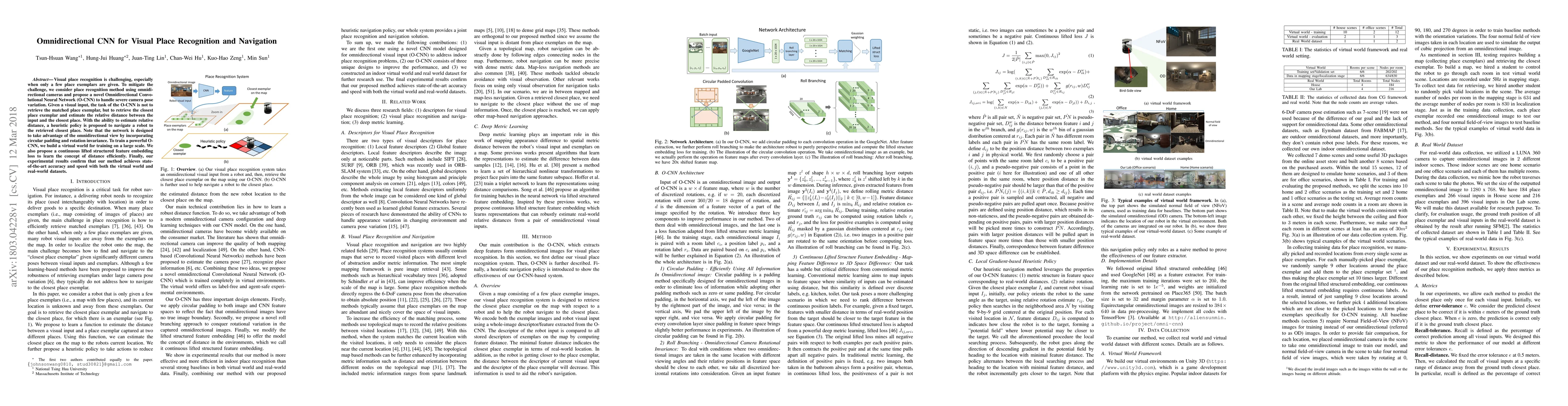 $ $Visual place recognition is challenging, especially when only a few place exemplars are given. To mitigate the challenge, we consider place recognition method using omnidirectional cameras and propose a novel Omnidirectional Convolutional Neural Network (O-CNN) to handle severe camera pose variation. Given a visual input, the task of the O-CNN is not to retrieve the matched place exemplar, but to retrieve the closest place exemplar and estimate the relative distance between the input and the closest place. With the ability to estimate relative distance, a heuristic policy is proposed to navigate a robot to the retrieved closest place. Note that the network is designed to take advantage of the omnidirectional view by incorporating circular padding and rotation invariance. To train a powerful O-CNN, we build a virtual world for training on a large scale. We also propose a continuous lifted structured feature embedding loss to learn the concept of distance efficiently. Finally, our experimental results confirm that our method achieves state-of-the-art accuracy and speed with both the virtual world and real-world datasets.