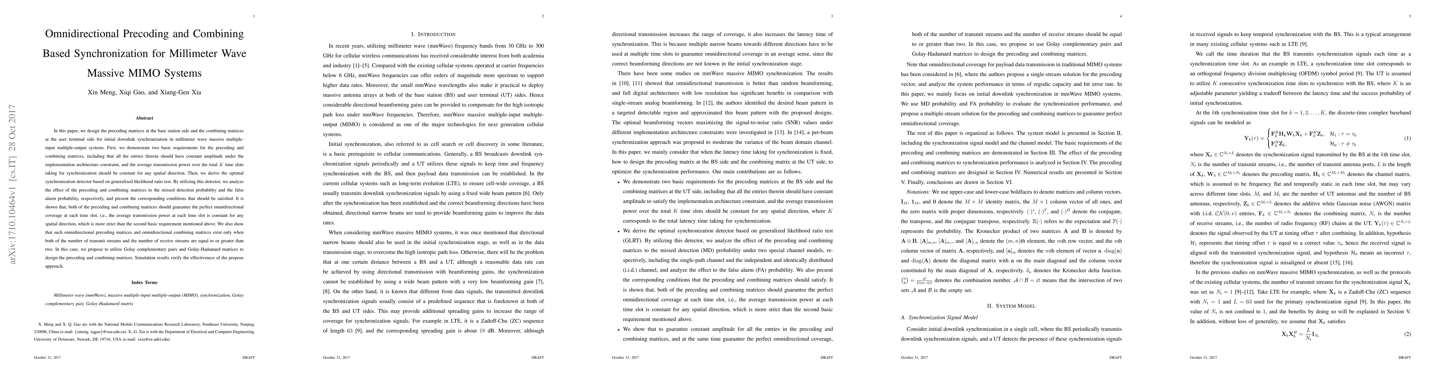 In this paper, we design the precoding matrices at the base station side and the combining matrices at the user terminal side for initial downlink synchronization in millimeter wave massive multiple-input multiple-output systems. First, we demonstrate two basic requirements for the precoding and combining matrices, including that all the entries therein should have constant amplitude under the implementation architecture constraint, and the average transmission power over the total K time slots taking for synchronization should be constant for any spatial direction. Then, we derive the optimal synchronization detector based on generalized likelihood ratio test. By utilizing this detector, we analyze the effect of the precoding and combining matrices to the missed detection probability and the false alarm probability, respectively, and present the corresponding conditions that should be satisfied. It is shown that, both of the precoding and combining matrices should guarantee the perfect omnidirectional coverage at each time slot, i.e., the average transmission power at each time slot is constant for any spatial direction, which is more strict than the second basic requirement mentioned above. We also show that such omnidirectional precoding matrices and omnidirectional combining matrices exist only when both of the number of transmit streams and the number of receive streams are equal to or greater than two. In this case, we propose to utilize Golay complementary pairs and Golay-Hadamard matrices to design the precoding and combining matrices. Simulation results verify the effectiveness of the propose approach.