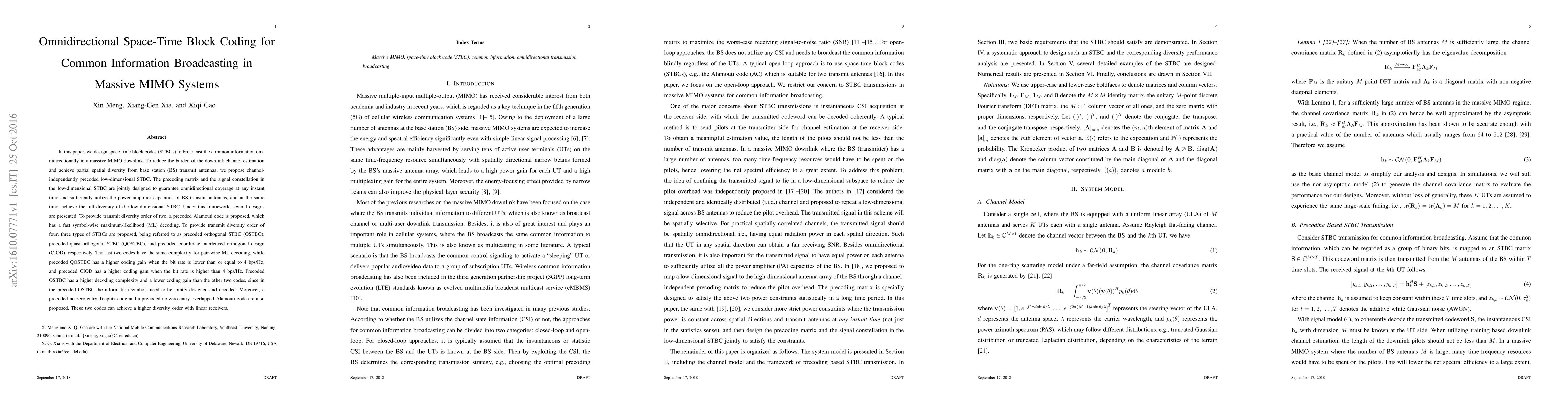 In this paper, we design space-time block codes (STBCs) to broadcast the common information omnidirectionally in a massive MIMO downlink. To reduce the burden of the downlink channel estimation and achieve partial spatial diversity from base station (BS) transmit antennas, we propose channel-independently precoded low-dimensional STBC. The precoding matrix and the signal constellation in the low-dimensional STBC are jointly designed to guarantee omnidirectional coverage at any instant time and sufficiently utilize the power amplifier capacities of BS transmit antennas, and at the same time, achieve the full diversity of the low-dimensional STBC. Under this framework, several designs are presented. To provide transmit diversity order of two, a precoded Alamouti code is proposed, which has a fast symbol-wise maximum-likelihood (ML) decoding. To provide transmit diversity order of four, three types of STBCs are proposed, being referred to as precoded orthogonal STBC (OSTBC), precoded quasi-orthogonal STBC (QOSTBC), and precoded coordinate interleaved orthogonal design (CIOD), respectively. The last two codes have the same complexity for pair-wise ML decoding, while precoded QOSTBC has a higher coding gain when the bit rate is lower than or equal to 4 bps/Hz, and precoded CIOD has a higher coding gain when the bit rate is higher than 4 bps/Hz. Precoded OSTBC has a higher decoding complexity and a lower coding gain than the other two codes, since in the precoded OSTBC the information symbols need to be jointly designed and decoded. Moreover, a precoded no-zero-entry Toeplitz code and a precoded no-zero-entry overlapped Alamouti code are also proposed. These two codes can achieve a higher diversity order with linear receivers.
