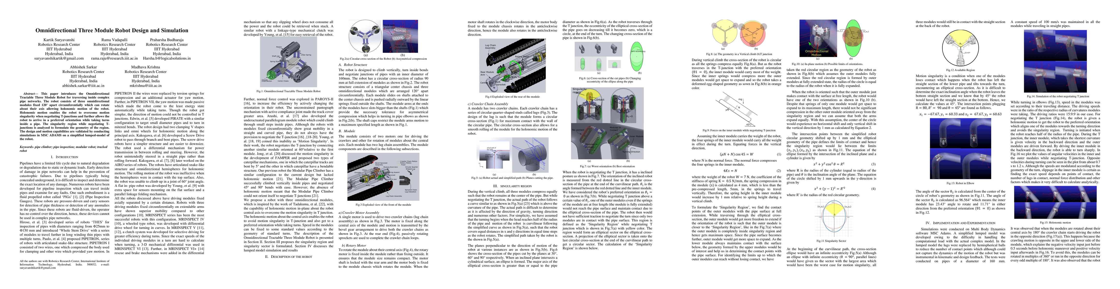 This paper introduces the Omnidirectional Tractable Three Module Robot for traversing inside complex pipe networks. The robot consists of three omnidirectional modules fixed 120{\deg} apart circumferentially which can rotate about their axis allowing holonomic motion of the robot. Holonomic motion enables the robot to overcome motion singularity when negotiating T-junctions and further allows the robot to arrive in a preferred orientation while taking turns inside a pipe. The singularity region while negotiating T-junctions is analyzed to formulate the geometry of the region. The design and motion capabilities are validated by conducting simulations in MSC ADAMS on a simplified lumped-model of the robot.