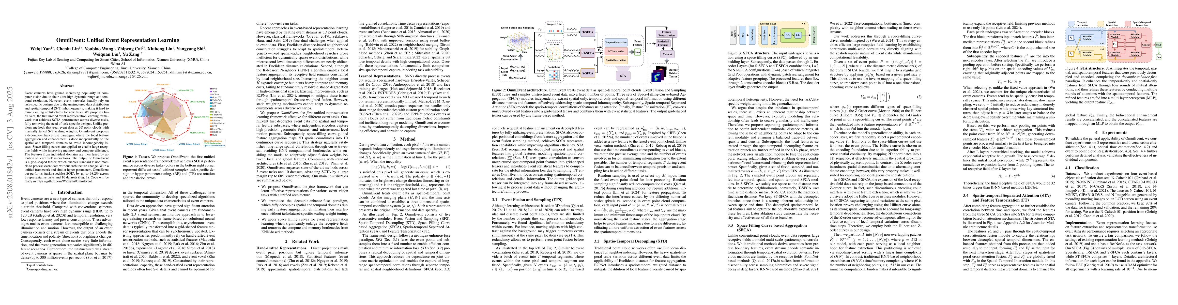 Event cameras have gained increasing popularity in computer vision due to their ultra-high dynamic range and temporal resolution. However, event networks heavily rely on task-specific designs due to the unstructured data distribution and spatial-temporal (S-T) inhomogeneity, making it hard to reuse existing architectures for new tasks. We propose OmniEvent, the first unified event representation learning framework that achieves SOTA performance across diverse tasks, fully removing the need of task-specific designs. Unlike previous methods that treat event data as 3D point clouds with manually tuned S-T scaling weights, OmniEvent proposes a decouple-enhance-fuse paradigm, where the local feature aggregation and enhancement is done independently on the spatial and temporal domains to avoid inhomogeneity issues. Space-filling curves are applied to enable large receptive fields while improving memory and compute efficiency. The features from individual domains are then fused by attention to learn S-T interactions. The output of OmniEvent is a grid-shaped tensor, which enables standard vision models to process event data without architecture change. With a unified framework and similar hyper-parameters, OmniEvent out-performs (tasks-specific) SOTA by up to 68.2% across 3 representative tasks and 10 datasets (Fig.1). Code will be ready in https://github.com/Wickyan/OmniEvent .