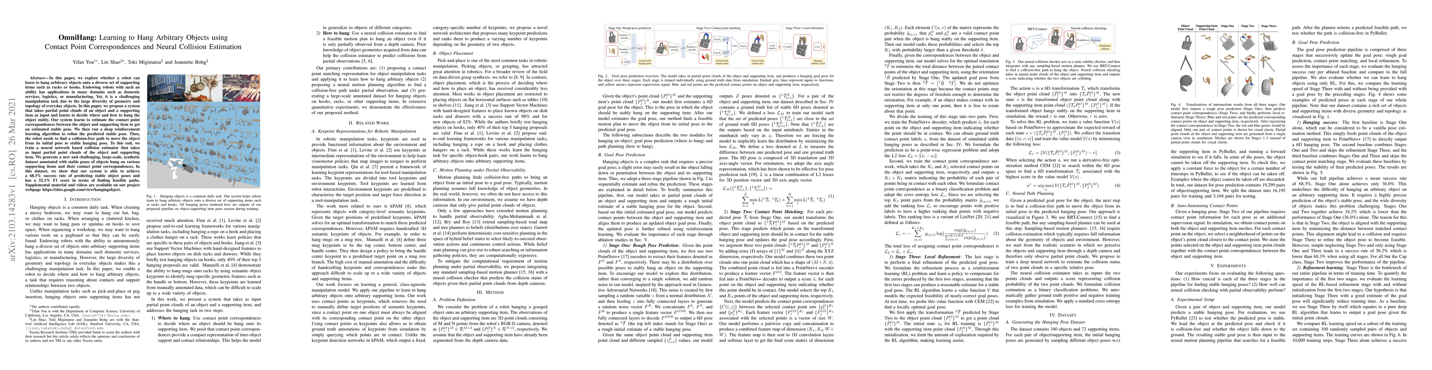 In this paper, we explore whether a robot can learn to hang arbitrary objects onto a diverse set of supporting items such as racks or hooks. Endowing robots with such an ability has applications in many domains such as domestic services, logistics, or manufacturing. Yet, it is a challenging manipulation task due to the large diversity of geometry and topology of everyday objects. In this paper, we propose a system that takes partial point clouds of an object and a supporting item as input and learns to decide where and how to hang the object stably. Our system learns to estimate the contact point correspondences between the object and supporting item to get an estimated stable pose. We then run a deep reinforcement learning algorithm to refine the predicted stable pose. Then, the robot needs to find a collision-free path to move the object from its initial pose to stable hanging pose. To this end, we train a neural network based collision estimator that takes as input partial point clouds of the object and supporting item. We generate a new and challenging, large-scale, synthetic dataset annotated with stable poses of objects hung on various supporting items and their contact point correspondences. In this dataset, we show that our system is able to achieve a 68.3% success rate of predicting stable object poses and has a 52.1% F1 score in terms of finding feasible paths. Supplemental material and videos are available on our project webpage.