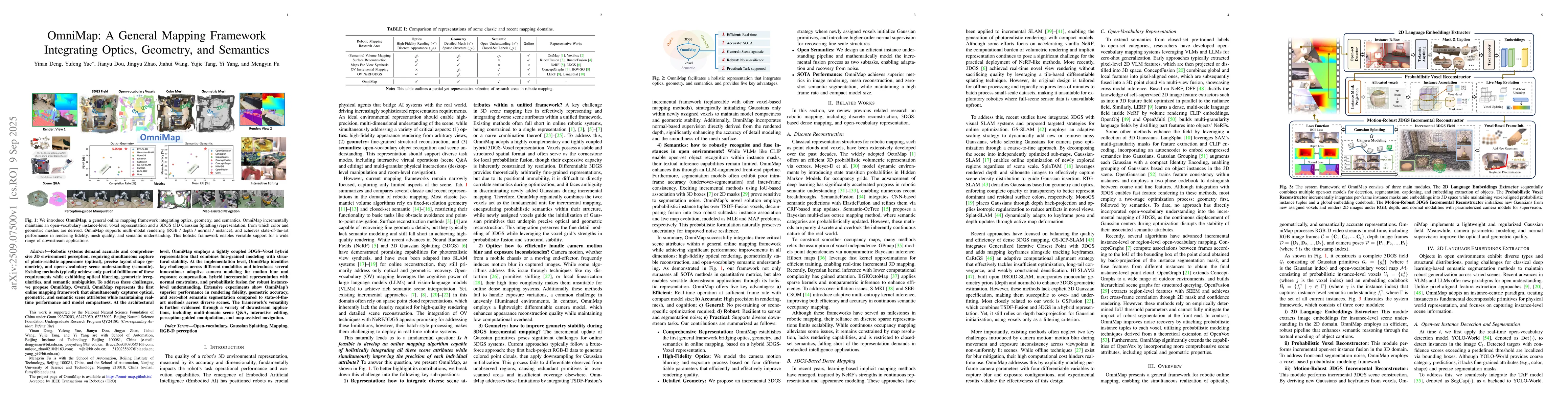 Robotic systems demand accurate and comprehensive 3D environment perception, requiring simultaneous capture of photo-realistic appearance (optical), precise layout shape (geometric), and open-vocabulary scene understanding (semantic). Existing methods typically achieve only partial fulfillment of these requirements while exhibiting optical blurring, geometric irregularities, and semantic ambiguities. To address these challenges, we propose OmniMap. Overall, OmniMap represents the first online mapping framework that simultaneously captures optical, geometric, and semantic scene attributes while maintaining real-time performance and model compactness. At the architectural level, OmniMap employs a tightly coupled 3DGS-Voxel hybrid representation that combines fine-grained modeling with structural stability. At the implementation level, OmniMap identifies key challenges across different modalities and introduces several innovations: adaptive camera modeling for motion blur and exposure compensation, hybrid incremental representation with normal constraints, and probabilistic fusion for robust instance-level understanding. Extensive experiments show OmniMap's superior performance in rendering fidelity, geometric accuracy, and zero-shot semantic segmentation compared to state-of-the-art methods across diverse scenes. The framework's versatility is further evidenced through a variety of downstream applications, including multi-domain scene Q&A, interactive editing, perception-guided manipulation, and map-assisted navigation.
