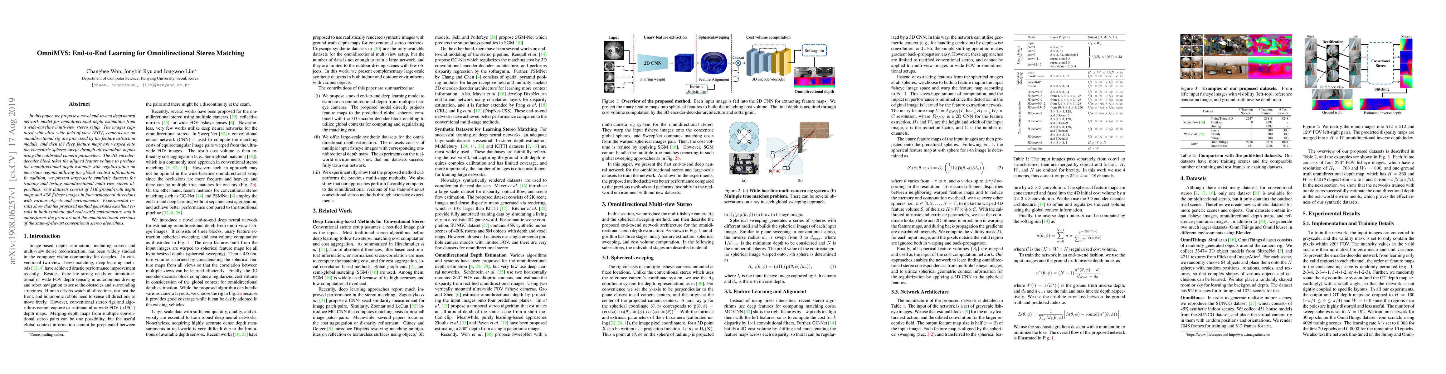 The paper introduces OmniMVS, an end-to-end deep neural network for omnidirectional depth estimation from multi-view stereo setups, achieving superior performance over conventional methods. It also provides large-scale synthetic datasets for training and testing.