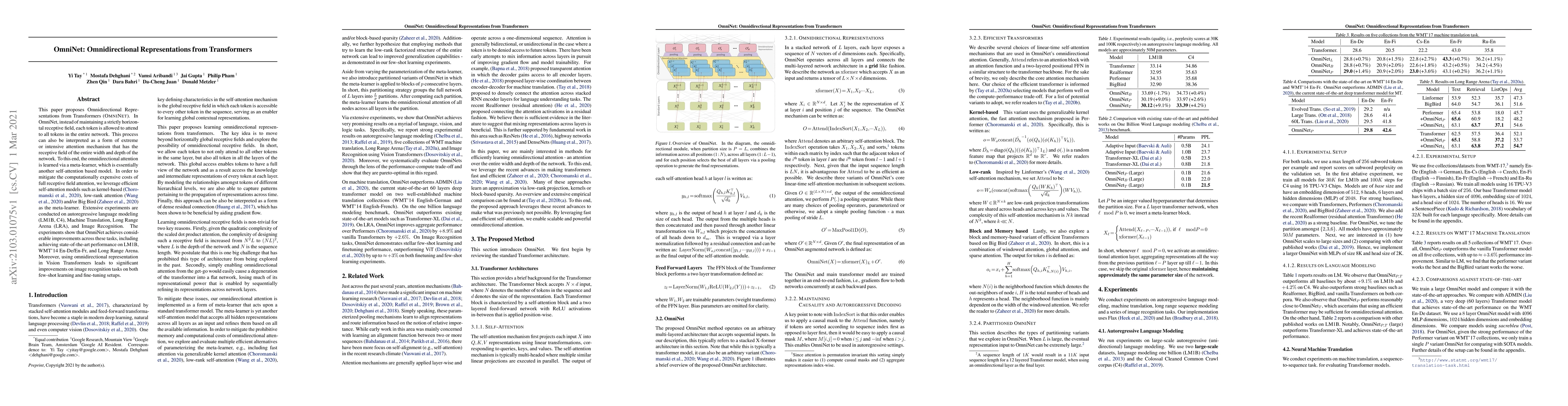 OmniNet proposes a transformer model with omnidirectional attention, allowing each token to attend to all others, achieved through a meta-learner. Experiments show significant improvements in language modeling, machine translation, and image recognition tasks, achieving state-of-the-art results in several benchmarks.