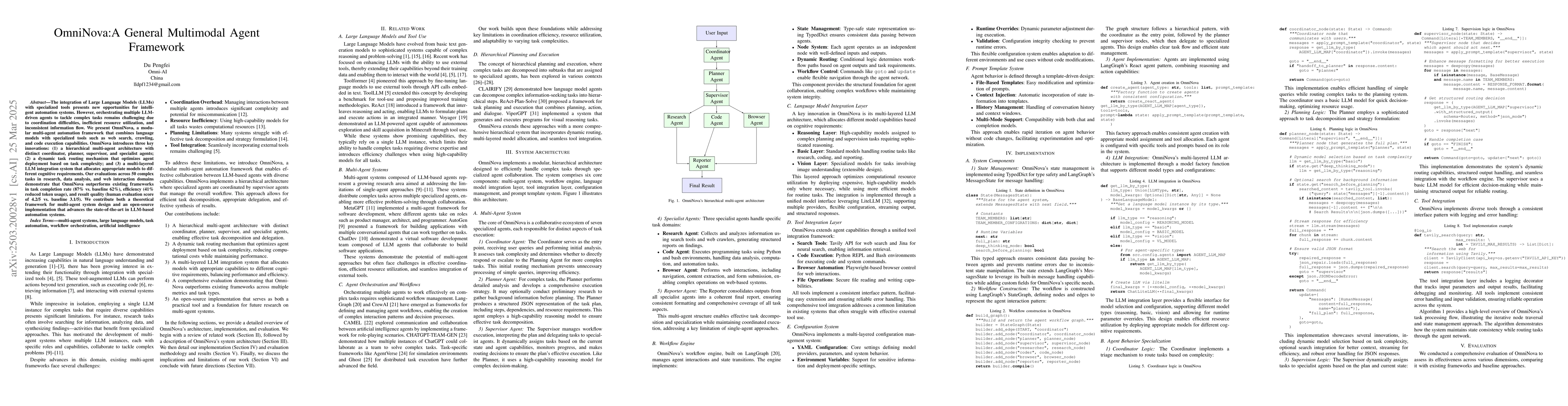 OmniNova is a modular multi-agent framework that combines language models with specialized tools to tackle complex tasks, featuring a hierarchical architecture, dynamic task optimization, and multi-layered LLM integration. It outperforms existing frameworks in task completion, efficiency, and result quality.