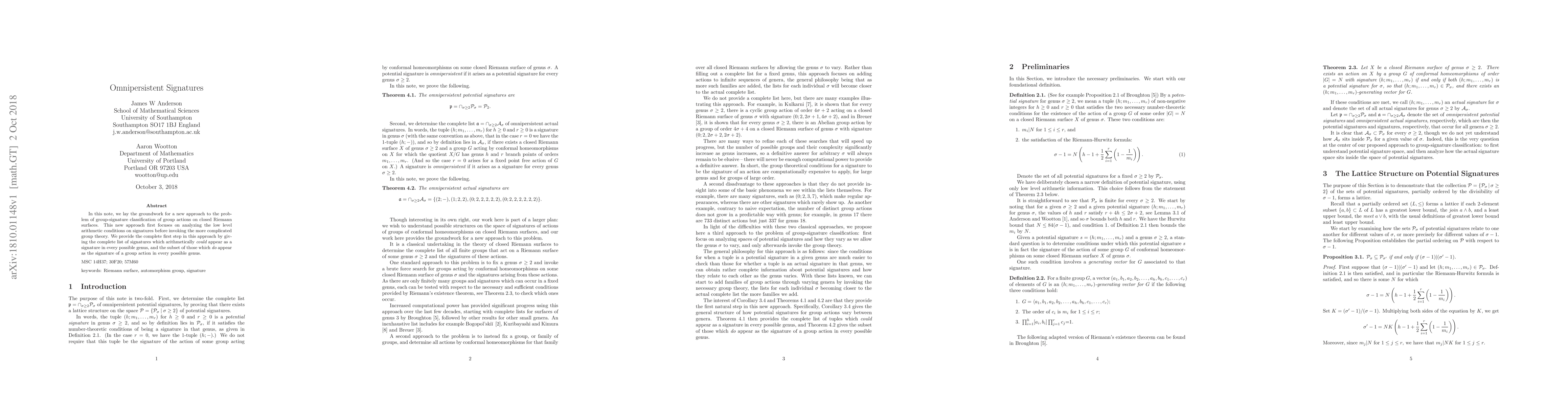 The paper introduces a novel lattice structure for potential signatures and identifies omnipersistent actual signatures, providing a new framework for analyzing group actions on Riemann surfaces.