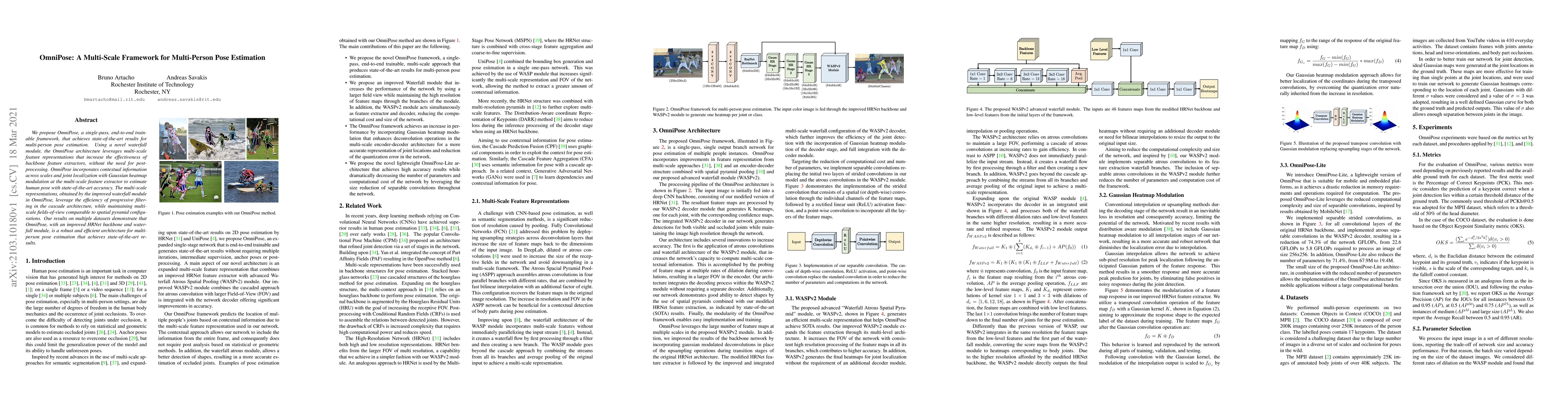 OmniPose is an advanced multi-scale framework for multi-person pose estimation that employs a novel waterfall module to enhance multi-scale feature representations, achieving state-of-the-art accuracy without post-processing. It leverages contextual information and Gaussian heatmap modulation for precise pose estimation.