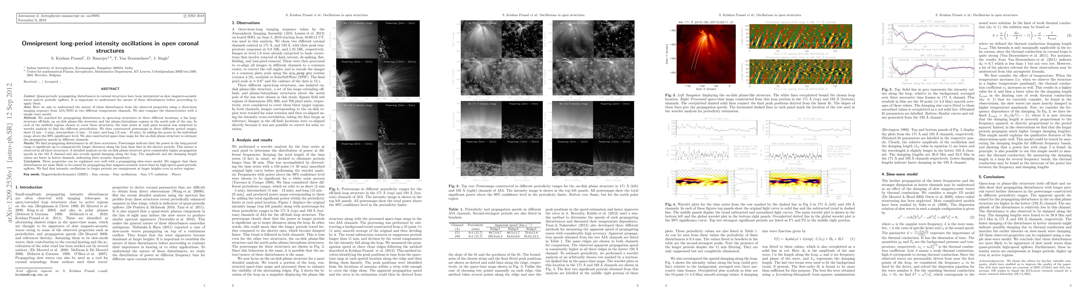 Quasi-periodic propagating disturbances in coronal structures have been interpreted as slow magneto-acoustic waves and/or periodic upflows. Here we aim to understand their nature from the observed properties using a three-hour imaging sequence from AIA/SDO in two different temperature channels. We also compare the characteristics with a simple wave model. We searched for propagating disturbances in open-loop structures at three different locations; a fan loop-structure off-limb, an on-disk plume-like structure and the plume/interplume regions in the north pole of the sun. In each of the subfield regions chosen to cover these structures, the time series at each pixel location was subjected to wavelet analysis to find the different periodicities. We then constructed powermaps in three different period ranges. We also constructed space-time maps for the on-disk plume structure to estimate the propagation speeds in different channels. We find propagating disturbances in all three structures. Powermaps indicate that the power in the long-period range is significant up to comparatively longer distances along the loop than that in the shorter periods. This nature is observed in all three structures. A detailed analysis on the on-disk plume structure gives consistently higher propagation speeds in the 193 \AA channel and also reveals spatial damping along the loop. The amplitude and the damping length values are lower in hotter channels, indicating their acoustic dependence. These properties can be explained very well with a propagating slow-wave model. We suggest that these disturbances are more likely to be caused by propagating slow magneto-acoustic waves than by high-speed quasi-periodic upflows. We find that intensity oscillations in longer periods are omnipresent at larger heights even in active regions.