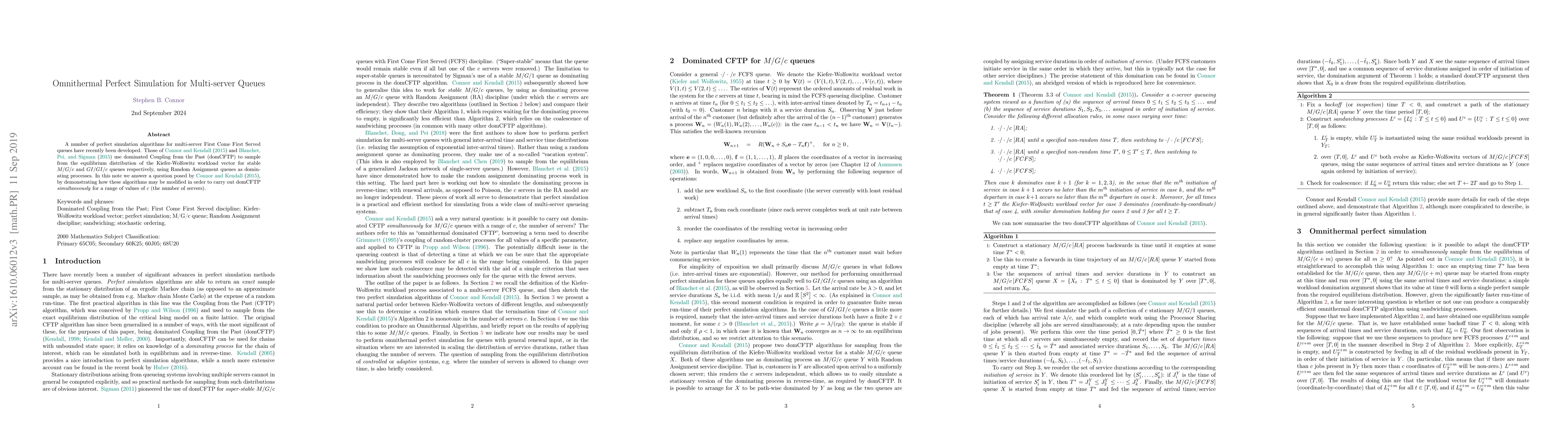 The research modifies Connor and Kendall's (2015) and Blanchet, Pei, and Sigman's (2015) perfect simulation algorithms for multi-server queues using dominated Coupling from the Past (domCFTP). It demonstrates how these algorithms can be adapted to carry out domCFTP simultaneously for a range of values of c (the number of servers).