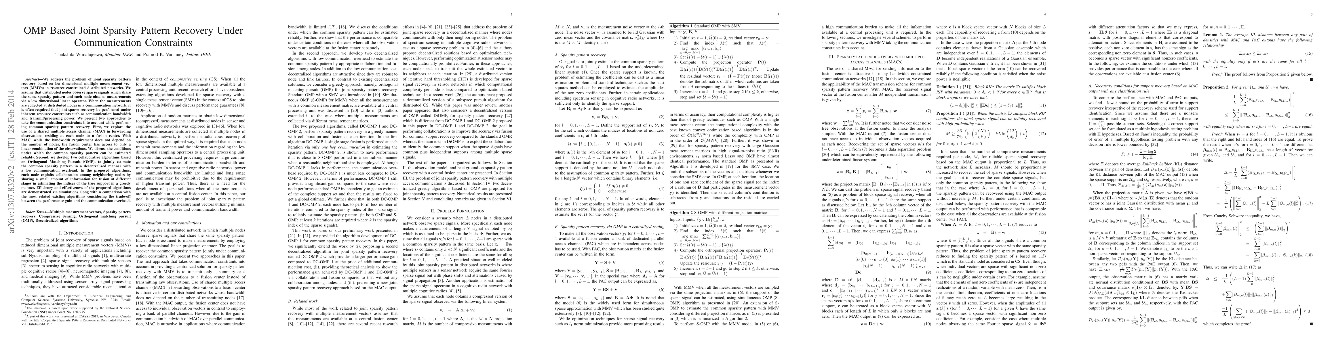 This paper tackles joint sparsity pattern recovery in resource-constrained distributed networks, focusing on low-dimensional multiple measurement vectors (MMVs). It proposes two approaches: one using a shared multiple access channel (MAC) and another employing collaborative Orthogonal Matching Pursuit (OMP) algorithms to minimize communication overhead while reliably estimating the common sparsity pattern. Simulation results compare the efficiency and effectiveness of the proposed methods against existing algorithms.
