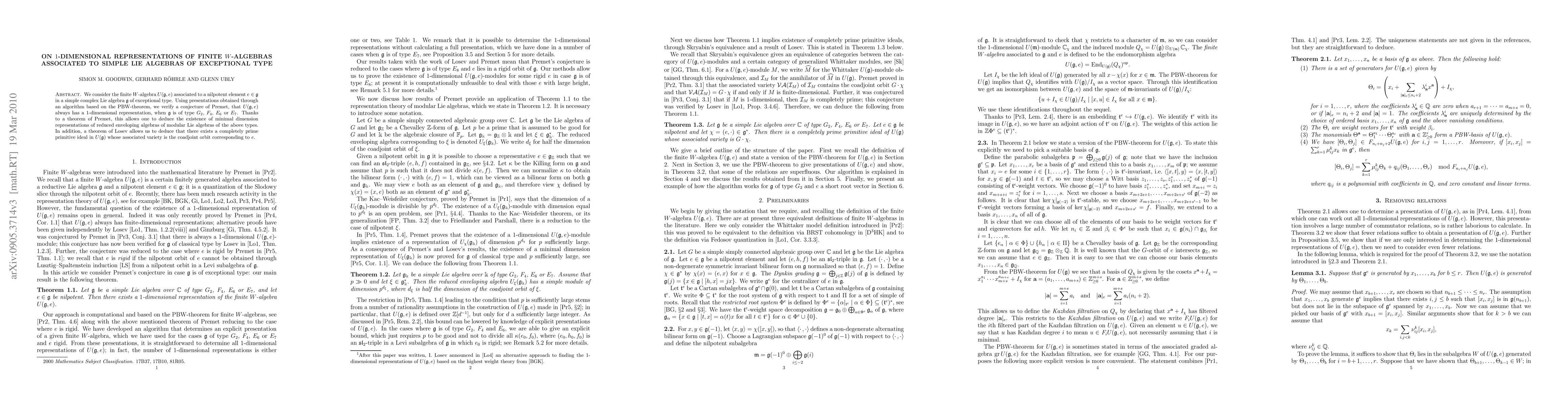We consider the finite $W$-algebra $U(\g,e)$ associated to a nilpotent element $e \in \g$ in a simple complex Lie algebra $\g$ of exceptional type. Using presentations obtained through an algorithm based on the PBW-theorem, we verify a conjecture of Premet, that $U(\g,e)$ always has a 1-dimensional representation, when $\g$ is of type $G_2$, $F_4$, $E_6$ or $E_7$. Thanks to a theorem of Premet, this allows one to deduce the existence of minimal dimension representations of reduced enveloping algebras of modular Lie algebras of the above types. In addition, a theorem of Losev allows us to deduce that there exists a completely prime primitive ideal in $U(\g)$ whose associated variety is the coadjoint orbit corresponding to $e$.