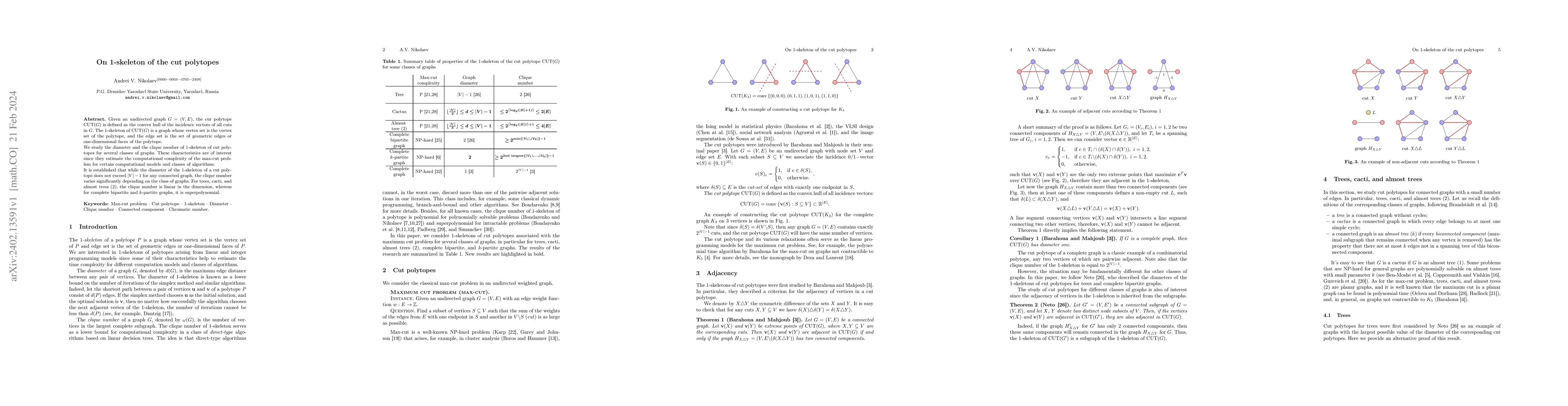 This paper investigates the diameter and clique number of the 1-skeleton of cut polytopes derived from various graph classes. While the diameter is bounded by $|V|-1$, the clique number varies, being linear for trees and cacti but superpolynomial for complete bipartite and $k$-partite graphs.